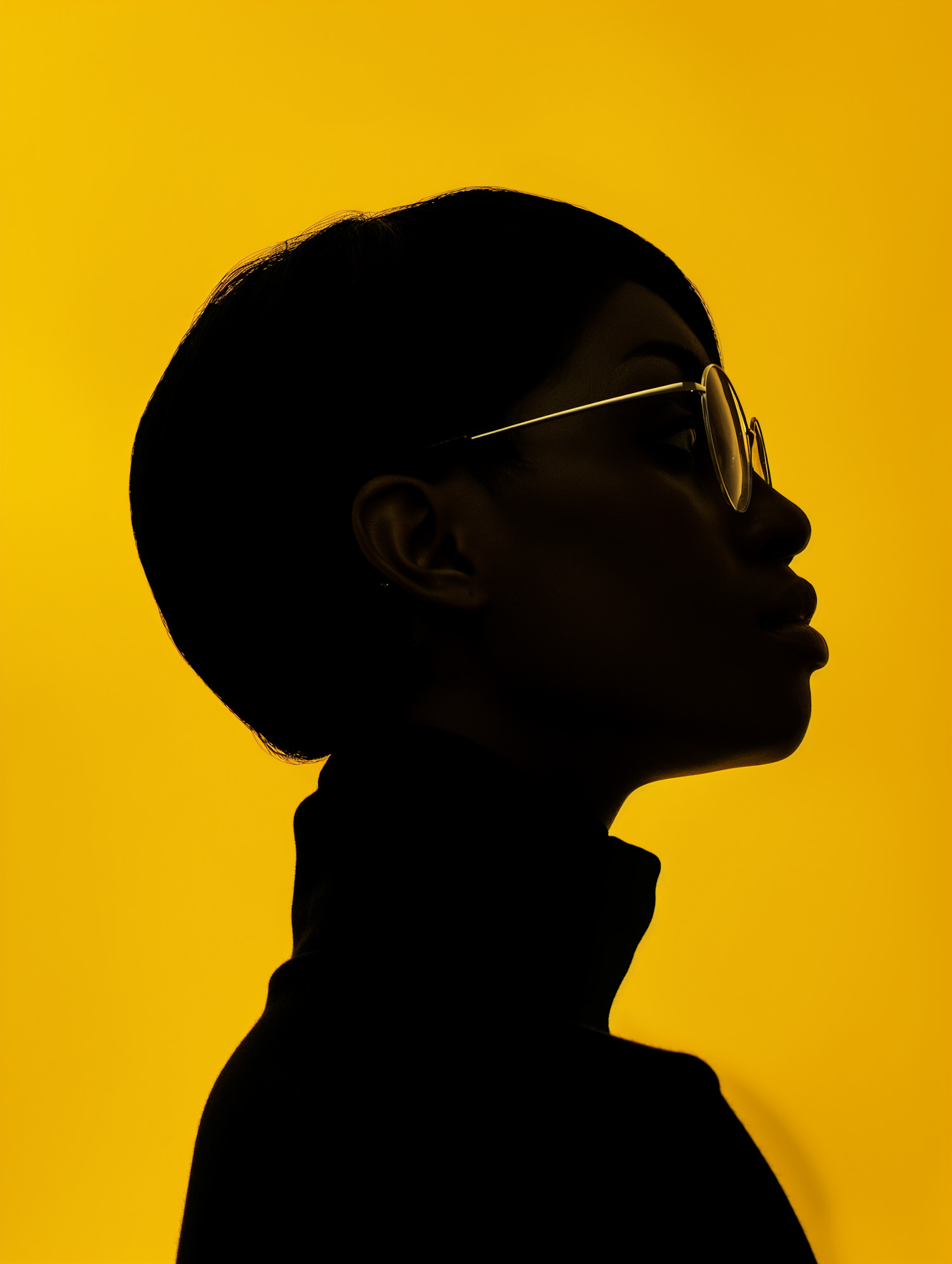Silhouette of a person with glasses against a vibrant yellow background, creating a dramatic and artistic profile.