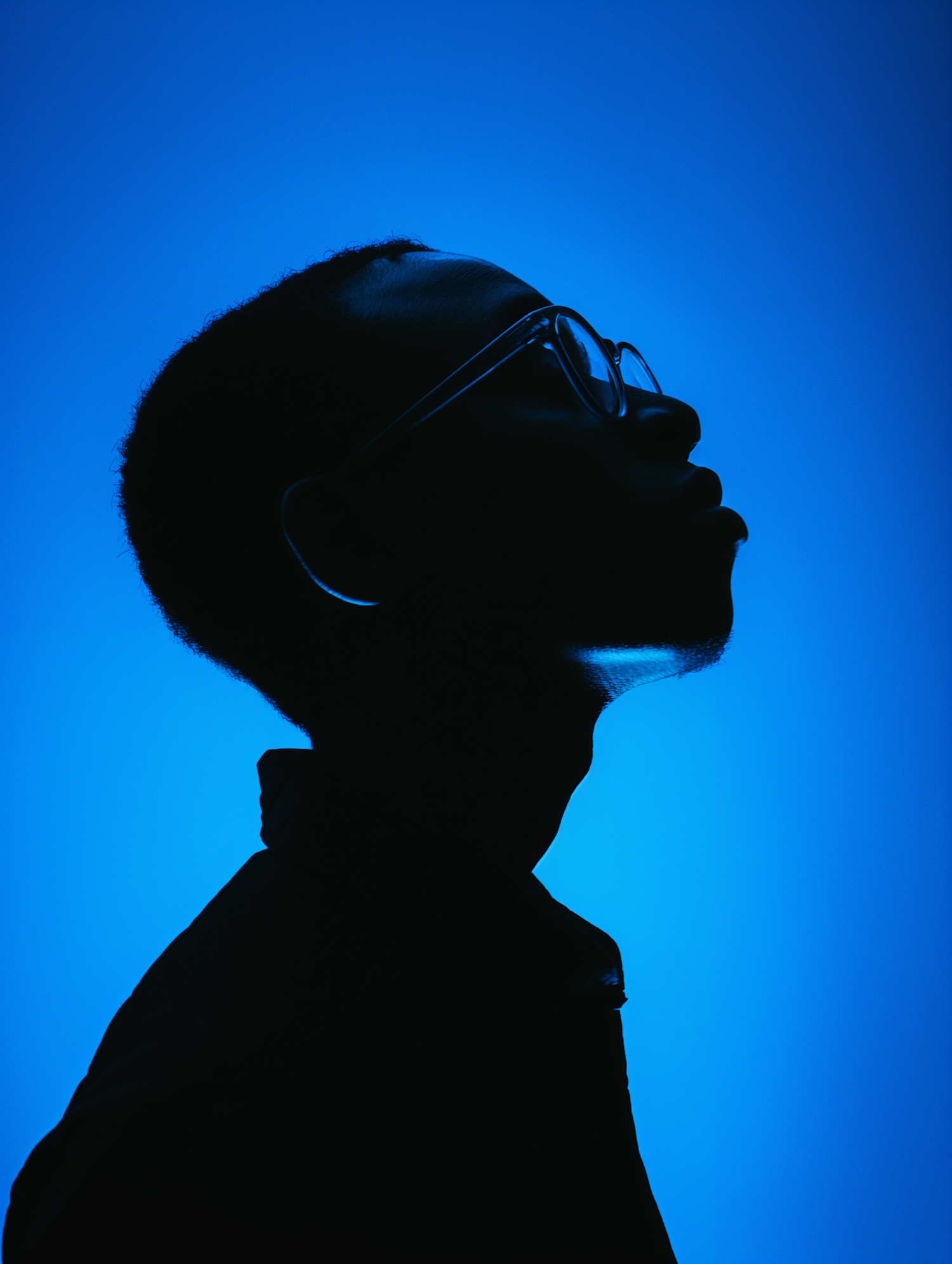 Silhouette of a person with glasses against a vibrant blue background, creating a dramatic and mysterious profile view.
