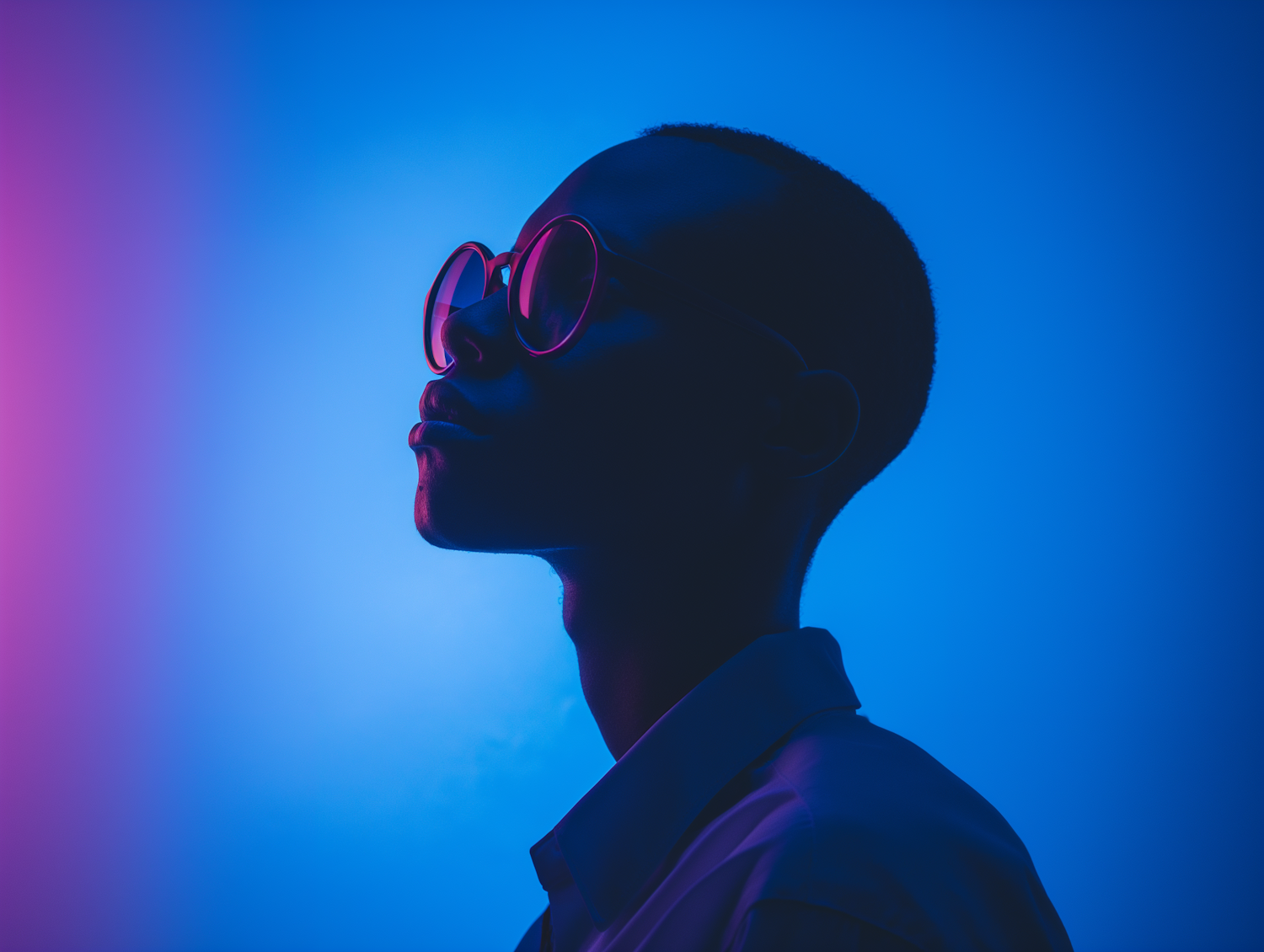 Profile portrait of a person in round glasses, illuminated by vibrant blue and pink lighting, creating a futuristic aesthetic.
