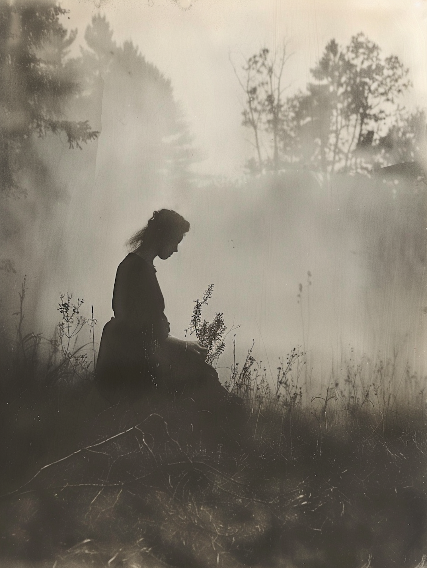 Silhouette of a woman in a misty landscape, surrounded by tall grasses and trees, creating a serene and mysterious atmosphere.