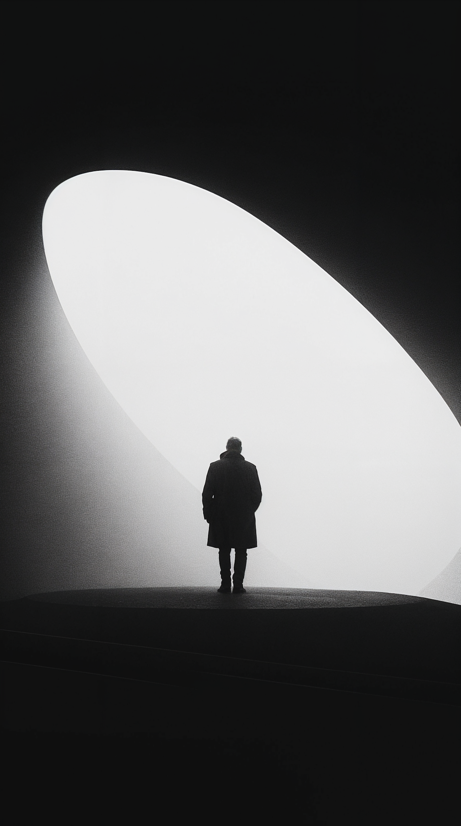 Silhouetted figure in a long coat stands before a large, bright oval light, creating a dramatic contrast in a minimalistic setting.