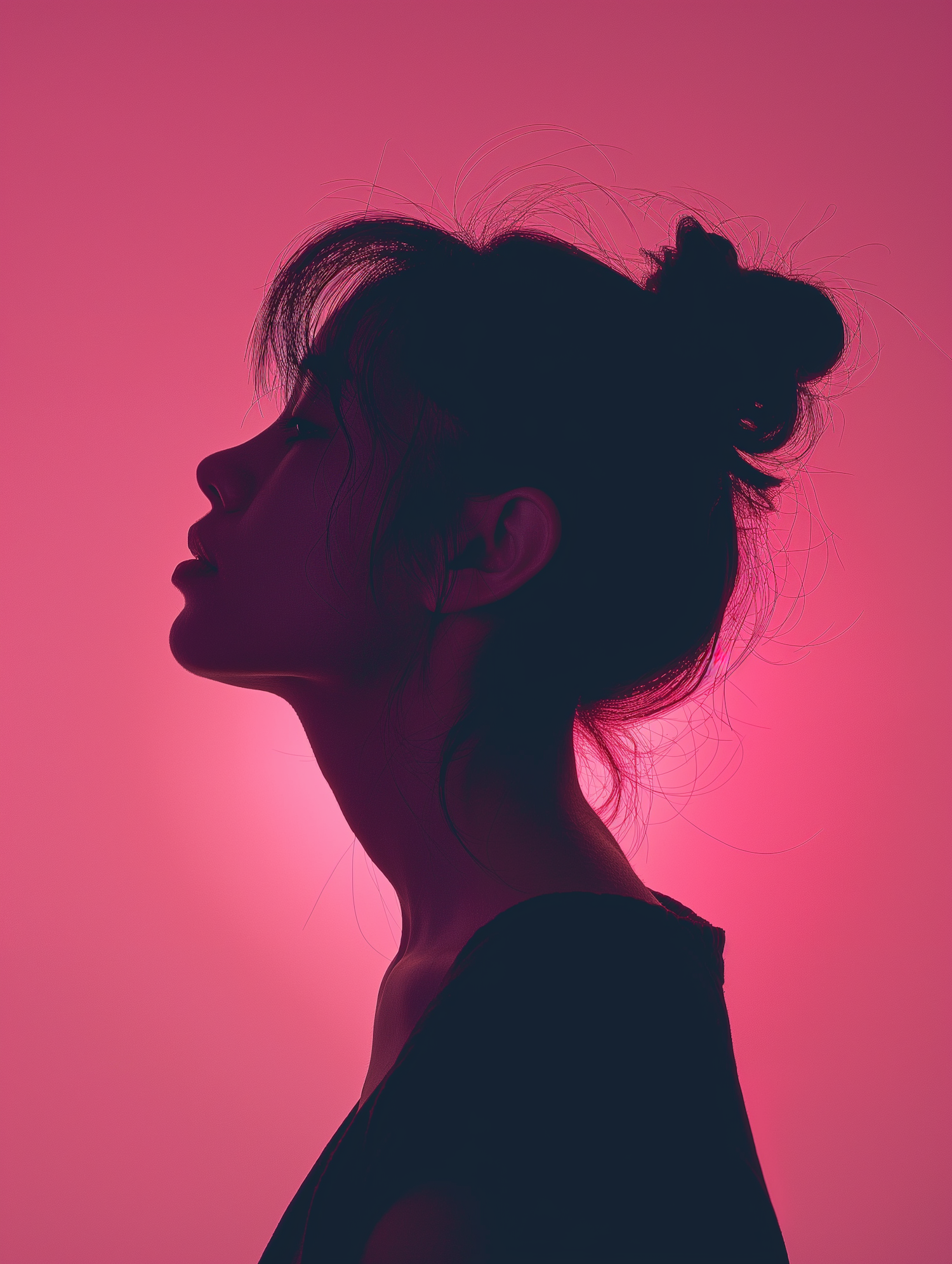 Silhouette of a woman with a messy bun against a vibrant pink background, creating a serene and artistic profile view.