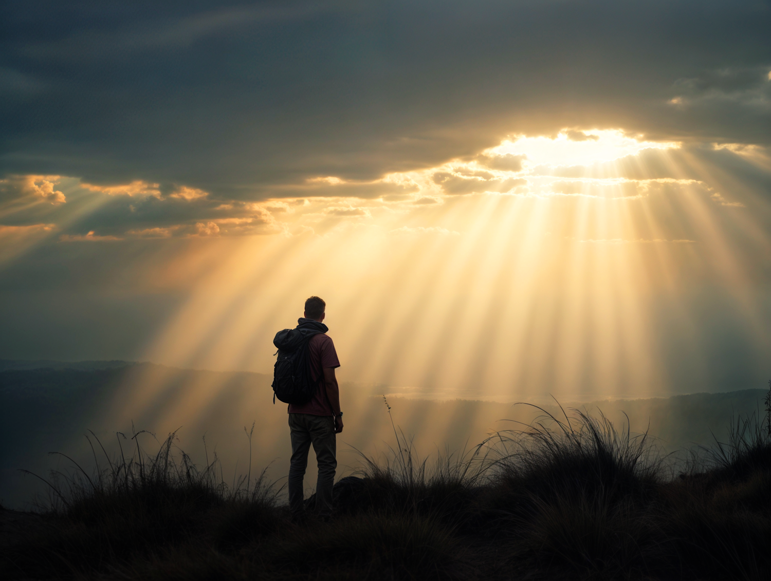 Silhouetted hiker on a hilltop, gazing at sun rays breaking through clouds, creating a dramatic and serene landscape.