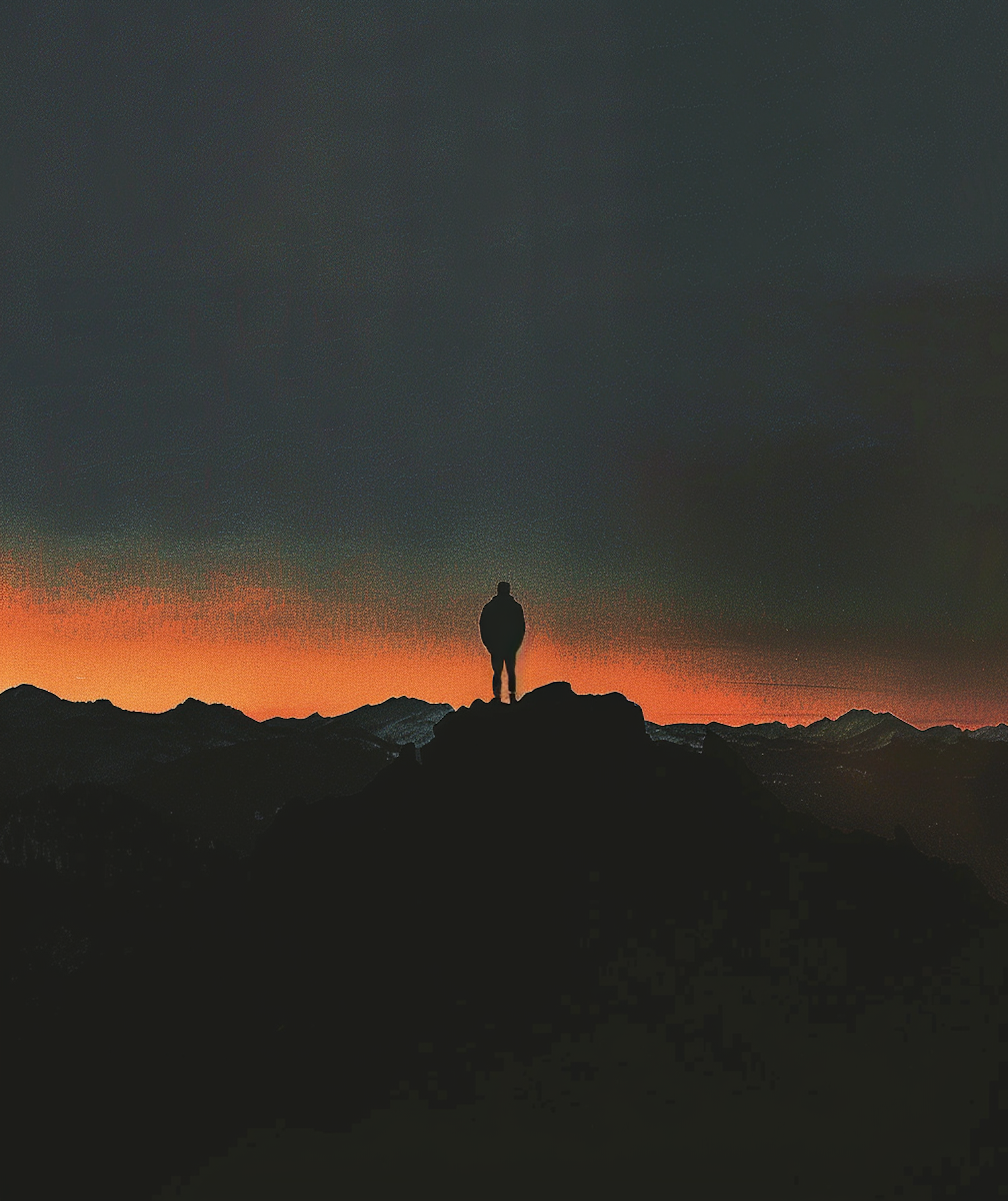 Silhouette of a person on a mountain peak against a vibrant sunset, evoking solitude and contemplation in a vast landscape.