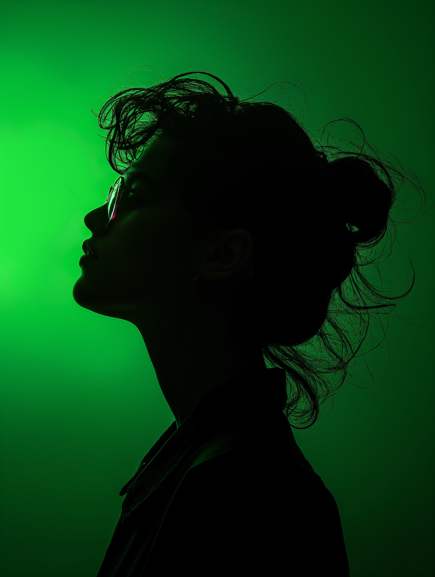 Silhouette of a person with glasses against a vibrant green background, creating a mysterious and artistic atmosphere.