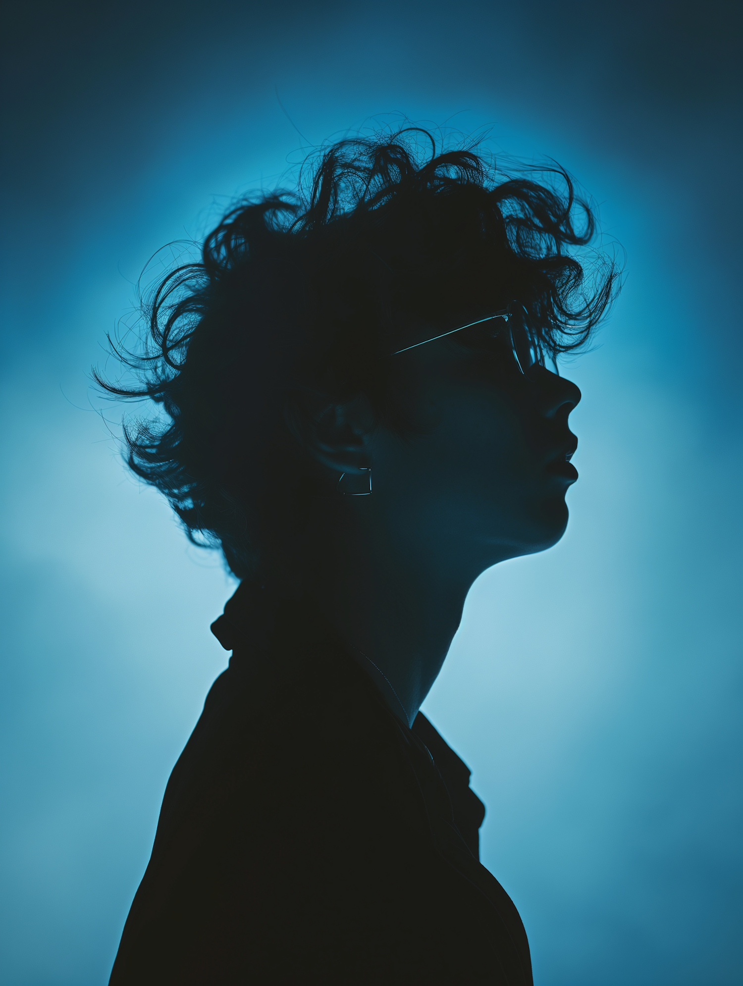 Silhouette of a person with curly hair and glasses against a vibrant blue background, creating a mysterious and artistic mood.