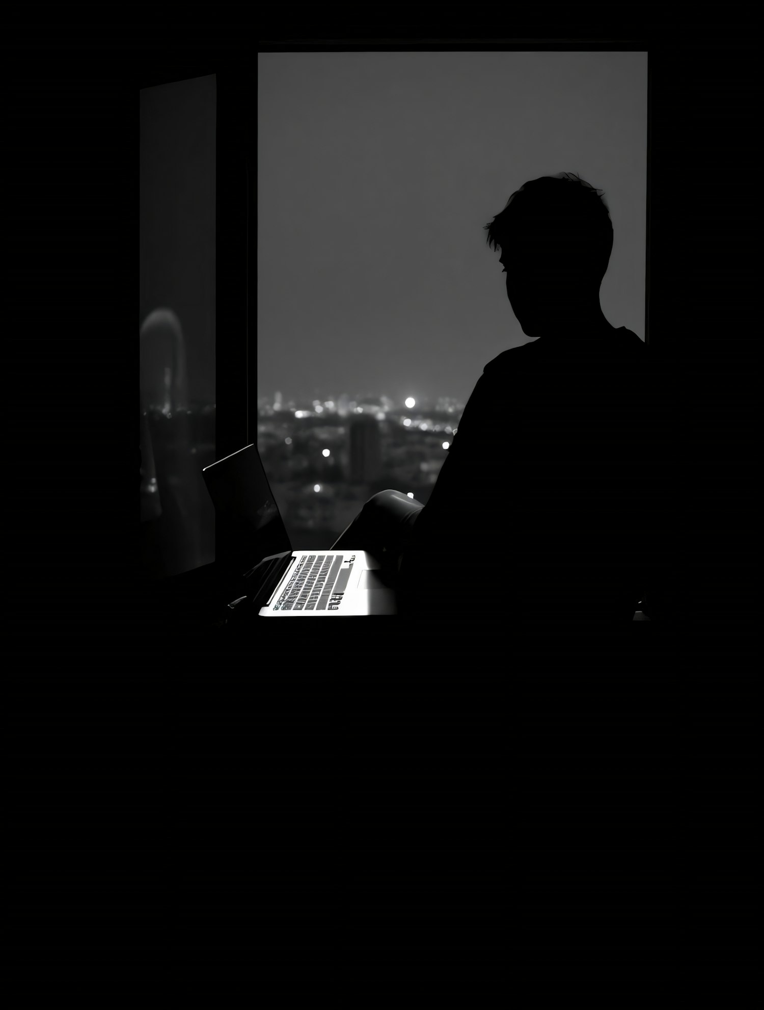 Silhouette of a person with a glowing laptop, gazing out at a cityscape at night through a window, creating a serene atmosphere.