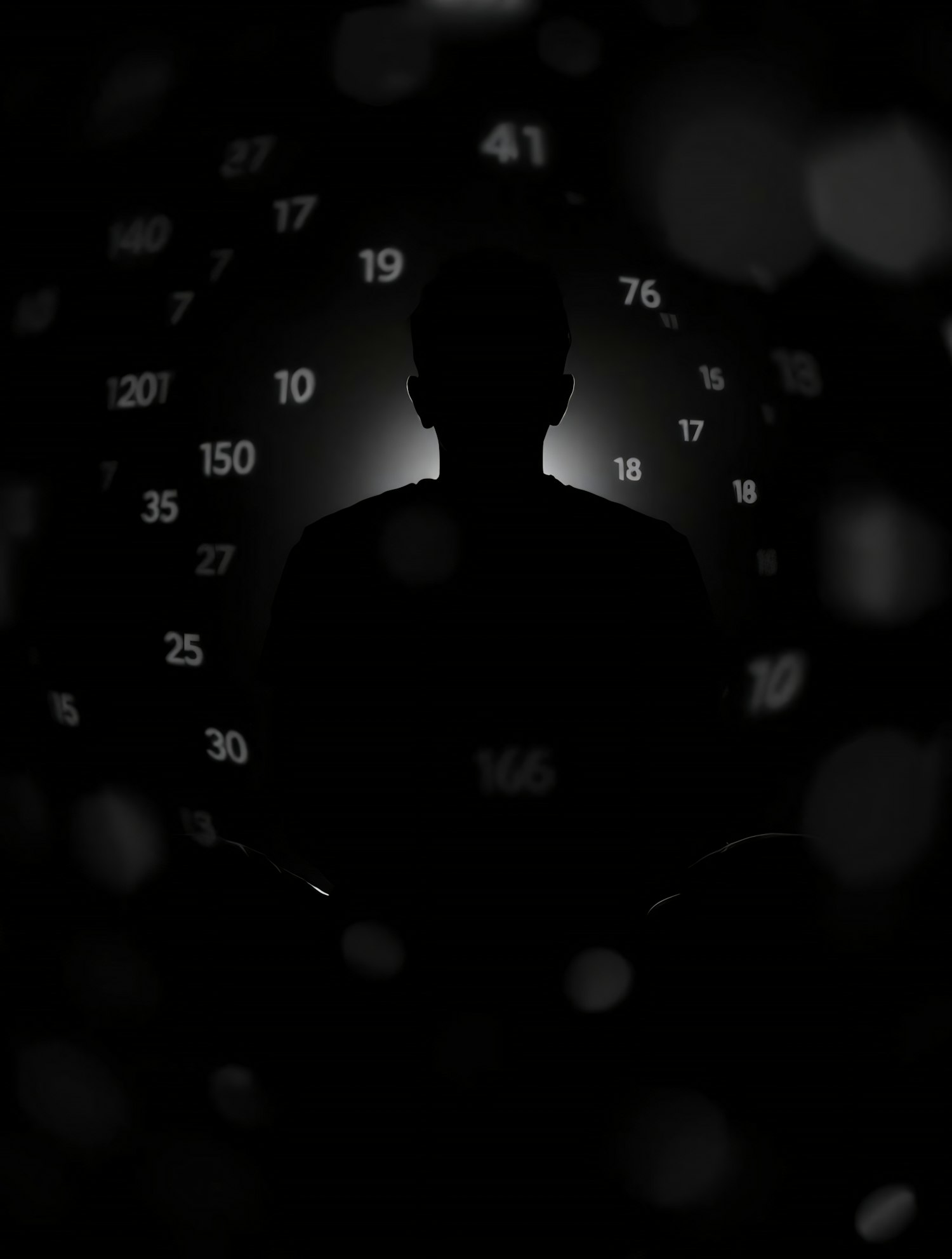 A silhouette of a person surrounded by glowing numbers in a dark, mysterious setting, evoking themes of introspection and abstraction.