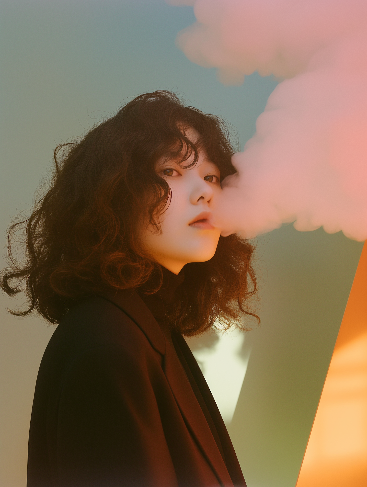 Asian woman with curly hair exhales pink smoke against a soft green and orange background, creating a dreamy, modern aesthetic.
