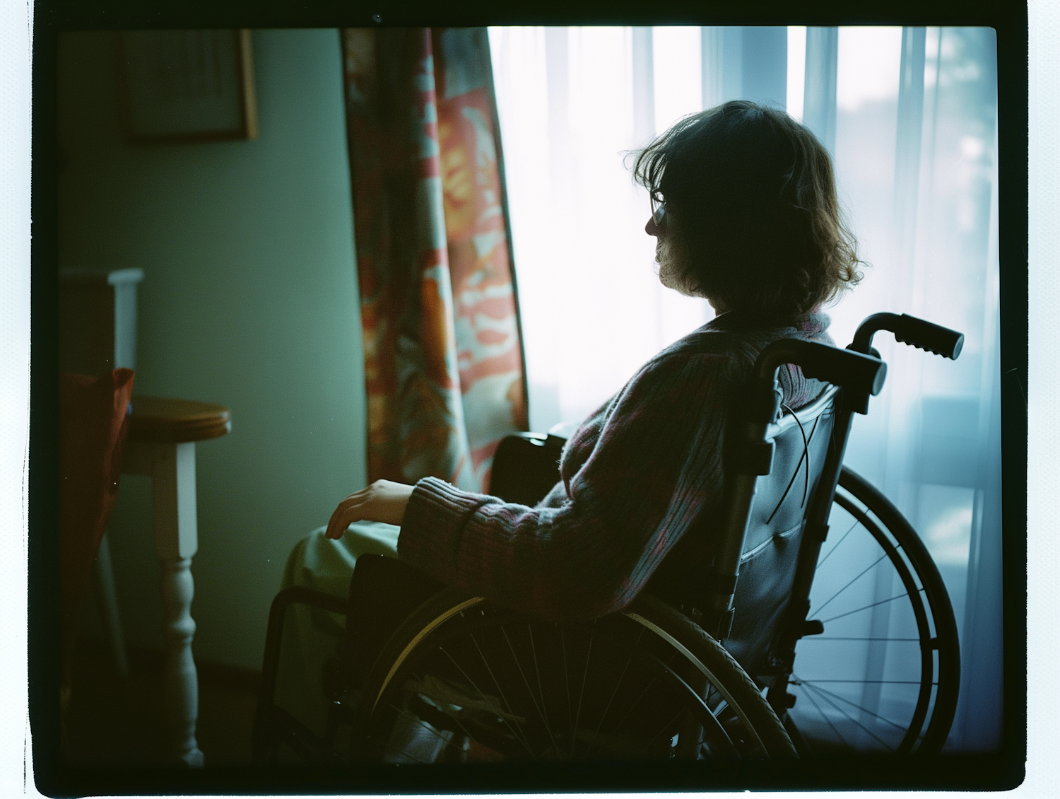 A person in a wheelchair gazes out a window, bathed in soft light, creating a serene and contemplative atmosphere.