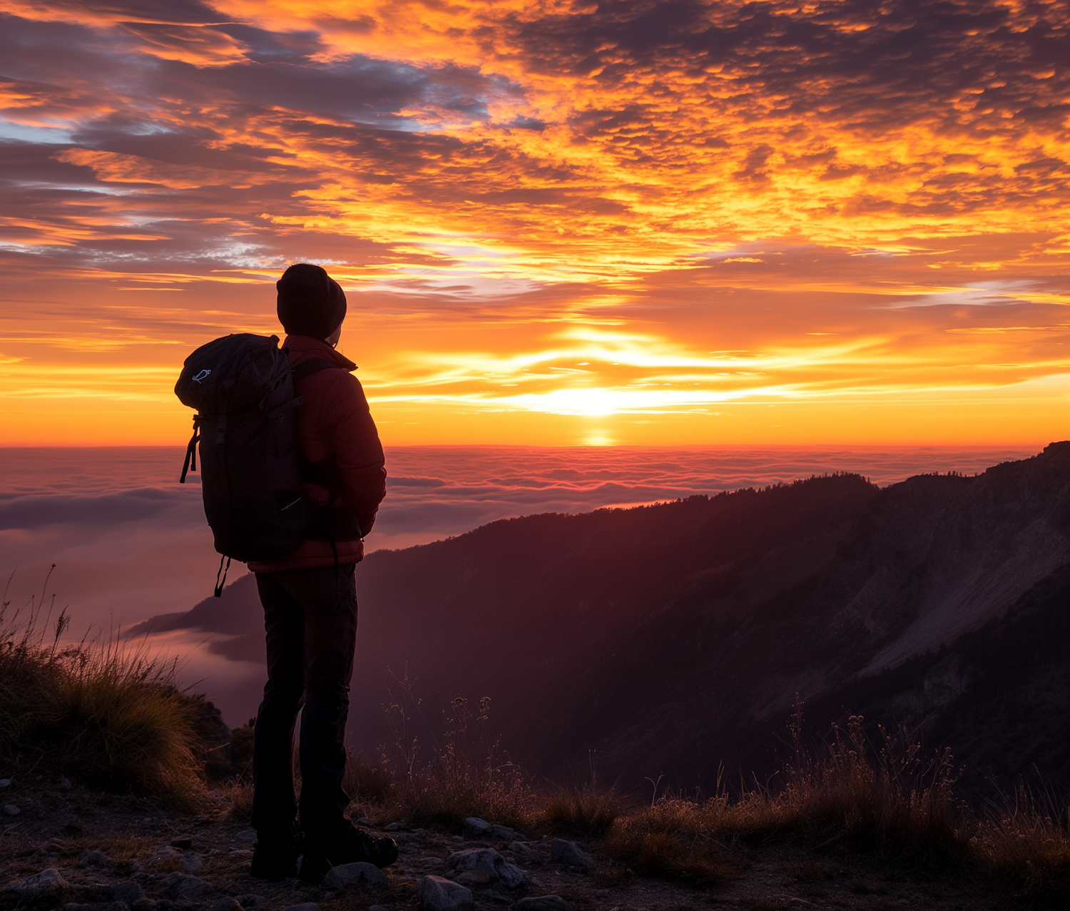 Silhouetted hiker on a mountain ridge at sunset, with vibrant orange and pink skies and a sea of clouds below.