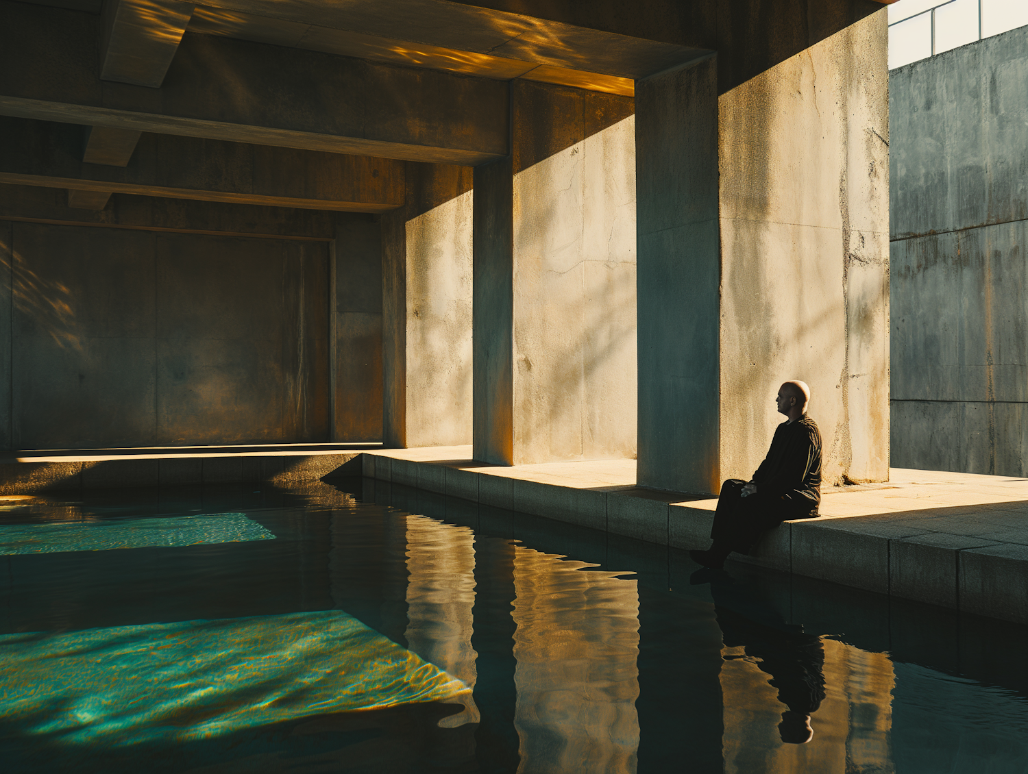 A contemplative figure sits by a reflective pool in a minimalist concrete structure, bathed in warm, golden light.