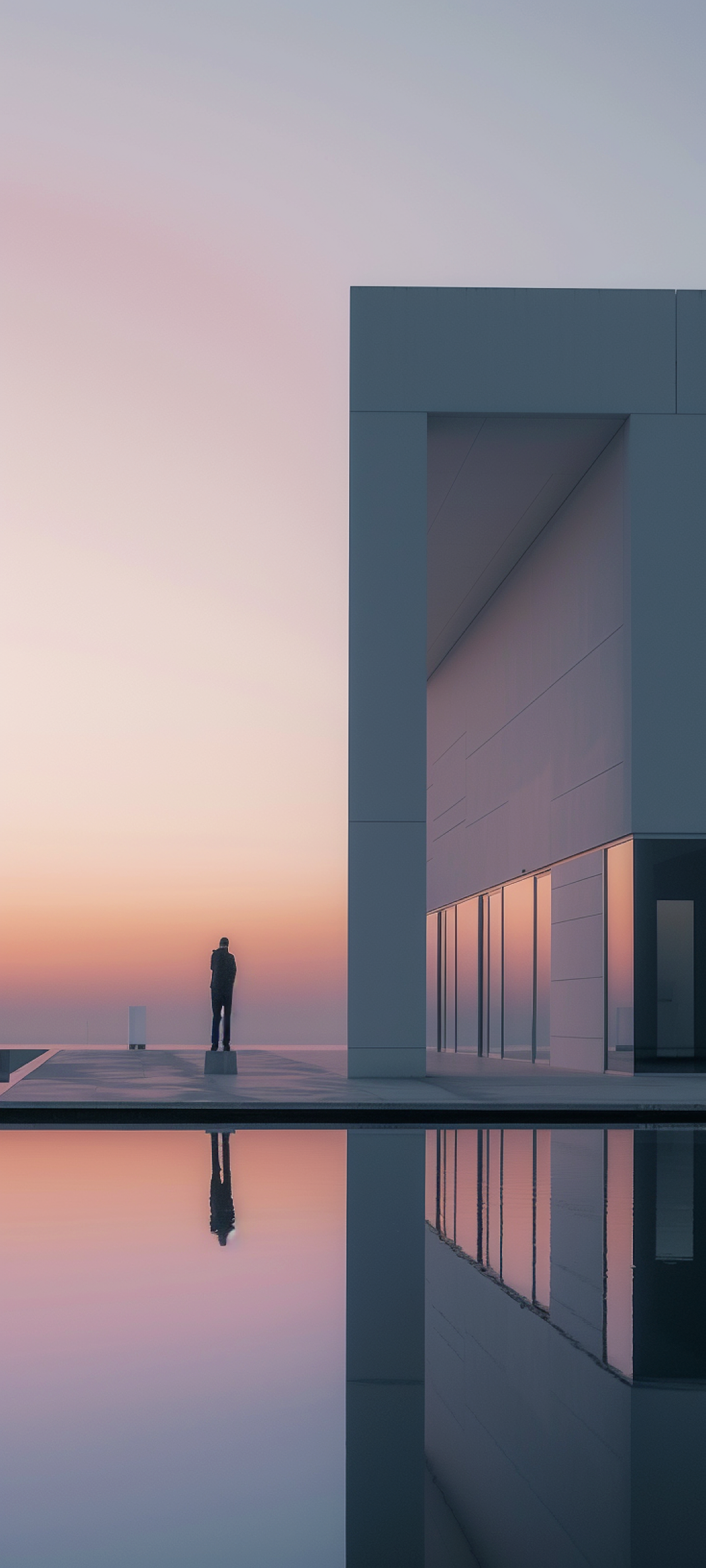 Minimalist scene with a lone figure, modern architecture, and a serene sunset reflection on water.