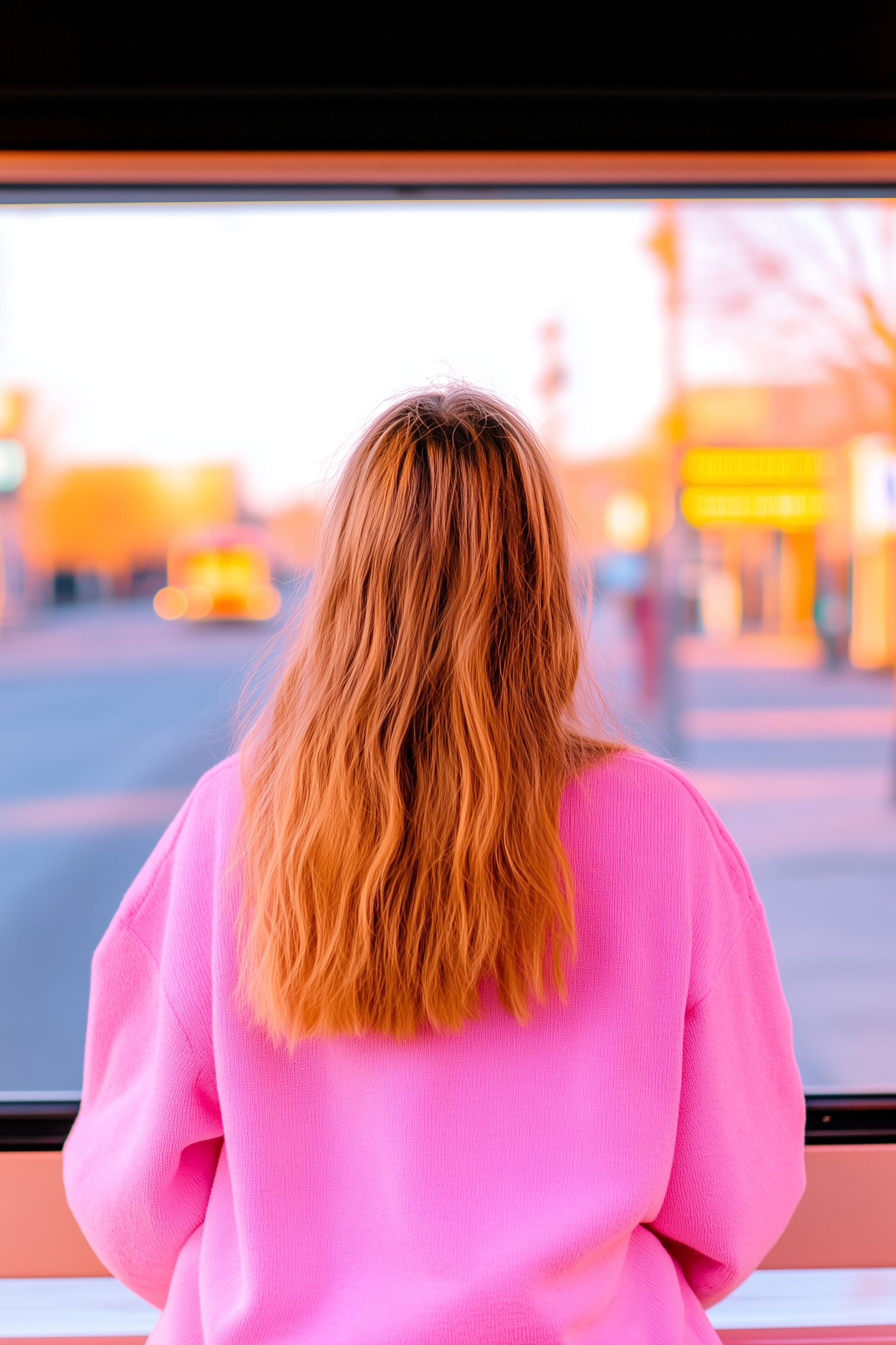 Person with long brown hair in a pink sweater gazes out a window at a sunlit street, creating a serene and colorful scene.