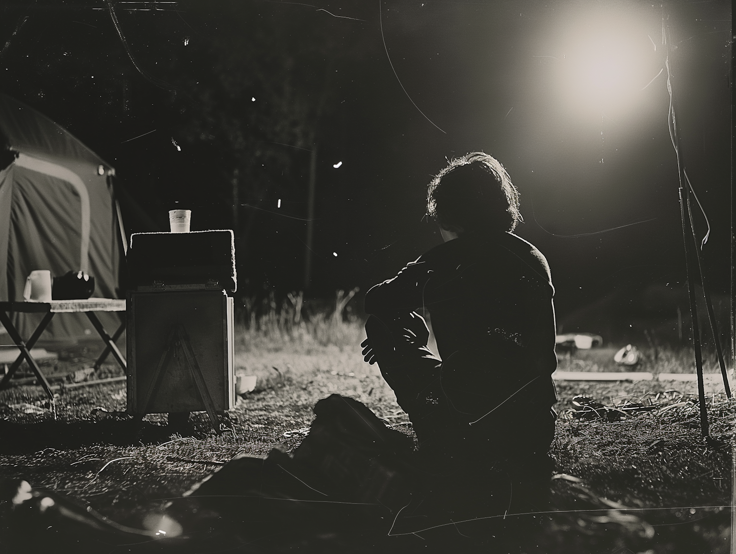 Black and white photo of a person sitting at a campsite at night, illuminated by a bright light, with a tent and table in the background.