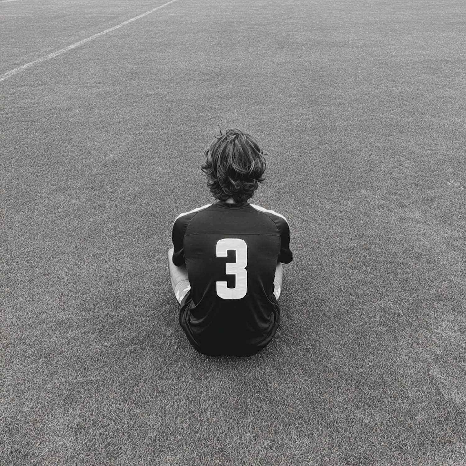 Black-and-white photo of a person sitting on a sports field, wearing a jersey with the number 3, creating a reflective and serene atmosphere.