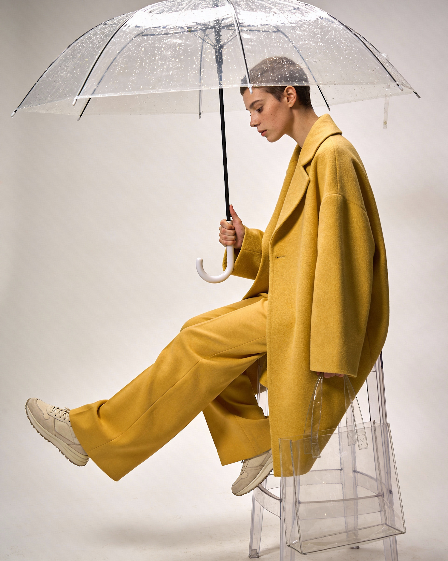 Stylish individual in a mustard-yellow outfit with a clear umbrella and tote bag, seated on a transparent chair against a neutral backdrop.