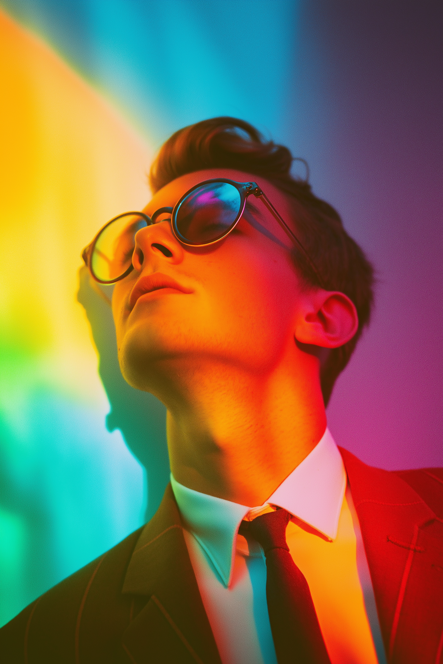 A young man in a suit and sunglasses basks in vibrant, colorful lighting, creating a dynamic and artistic visual effect.