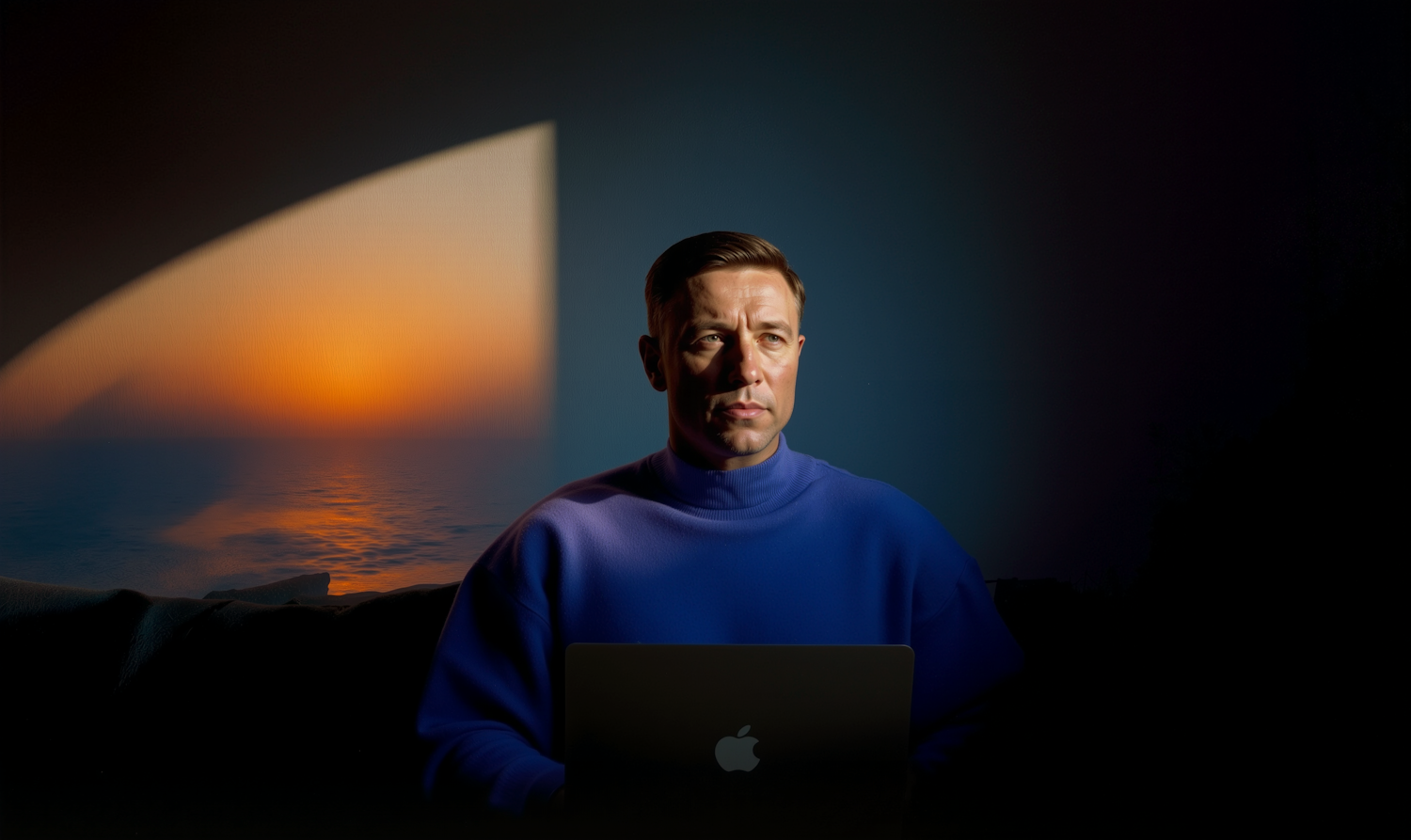 A man in a blue sweater works on a laptop, with a vivid sunset over the ocean visible in the background.