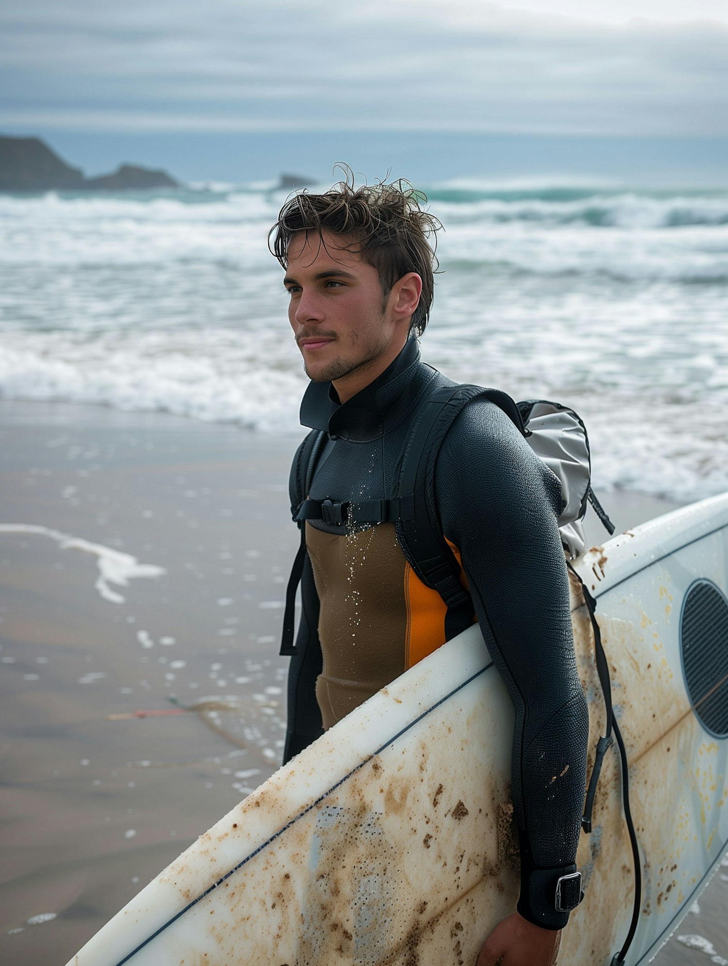 Young surfer in wetsuit holding a surfboard on a cloudy beach, gazing at the ocean waves with a contemplative expression.