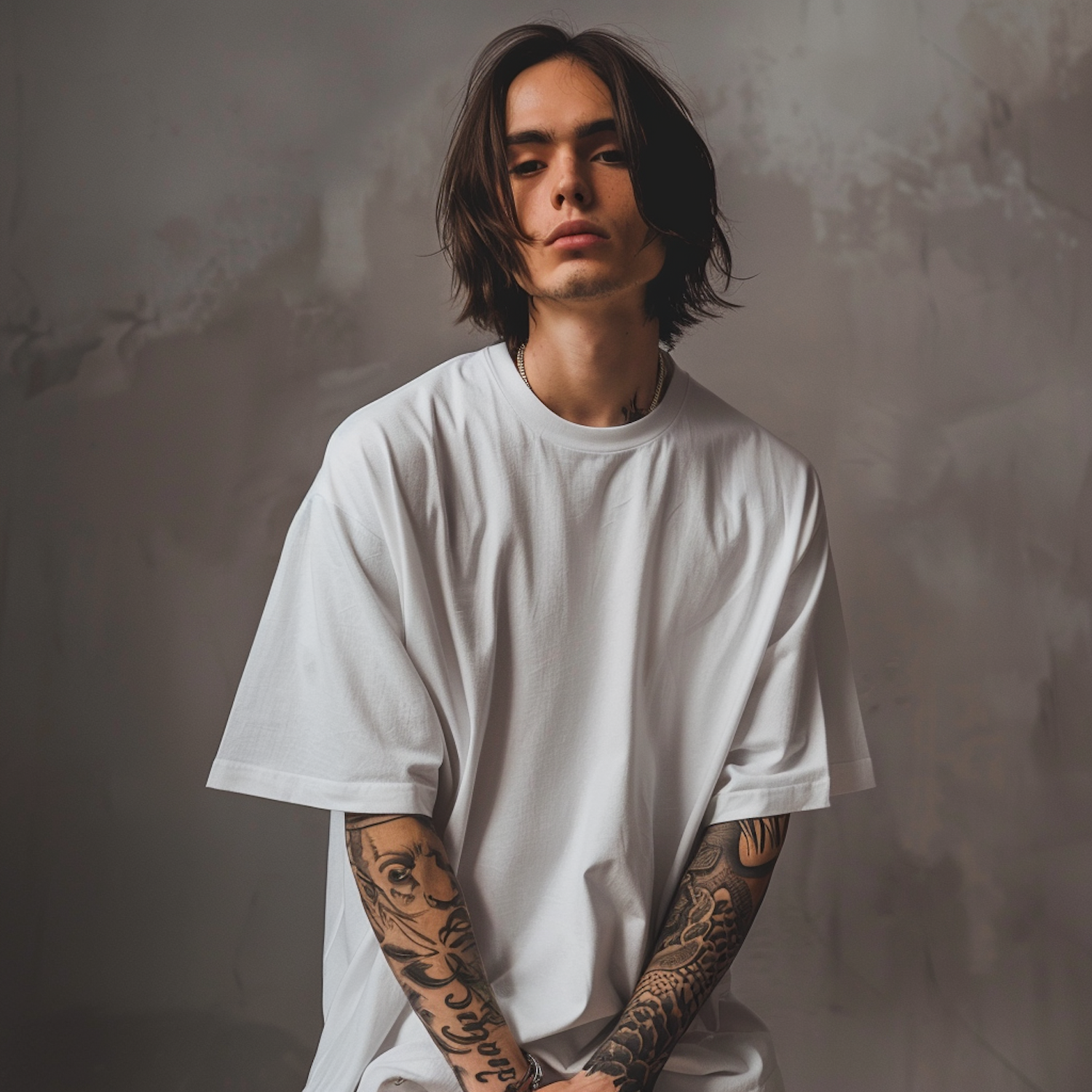 Young Asian man with tattoos and long hair in a white t-shirt against a gray background, exuding a casual and artistic vibe.