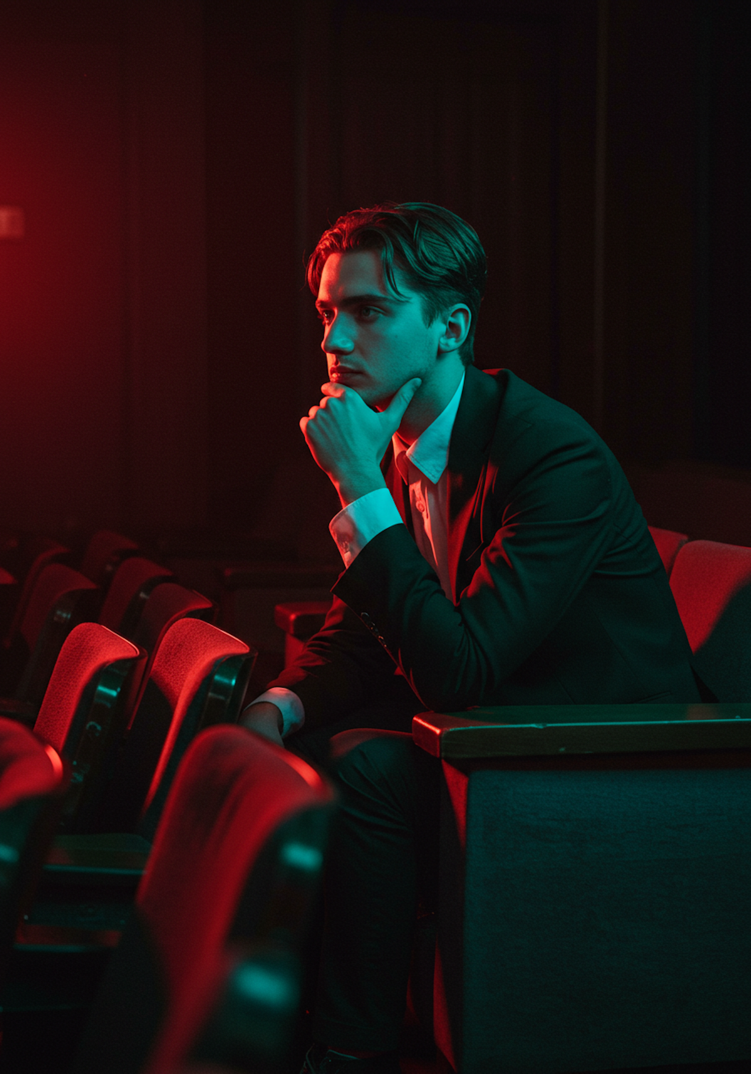 A contemplative man in a suit sits in a dimly lit theater, bathed in red and green light, creating a cinematic and moody atmosphere.