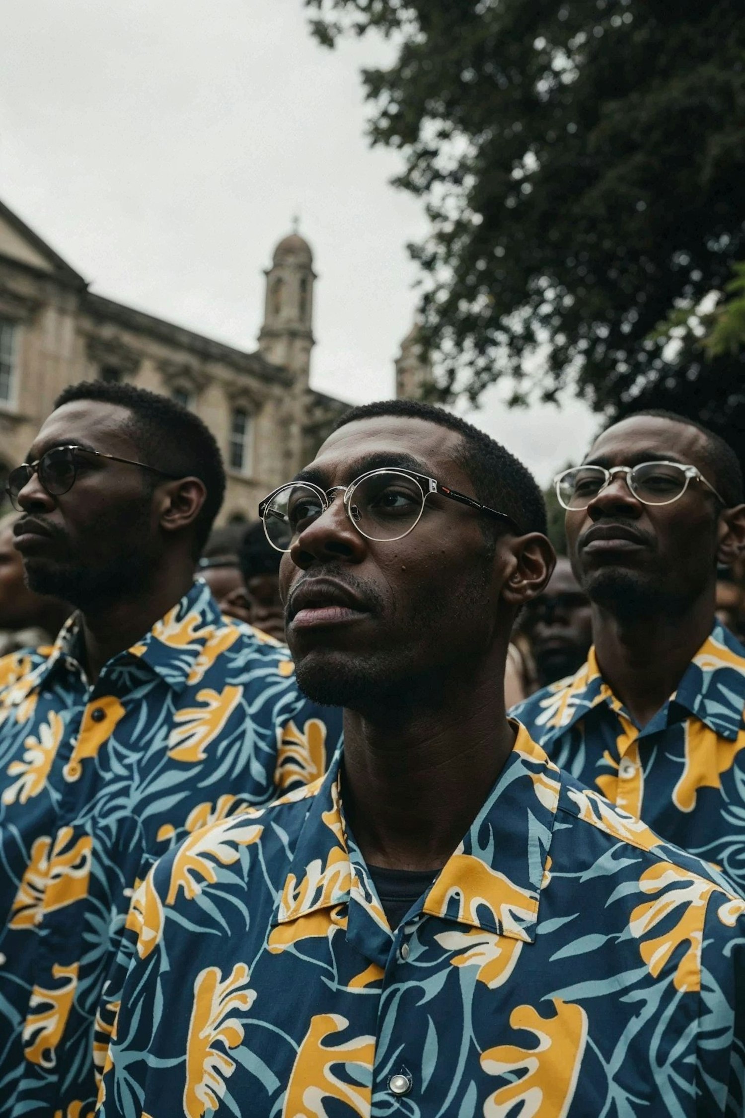 Three men in matching patterned shirts stand outdoors, wearing glasses and looking upwards with serious expressions.