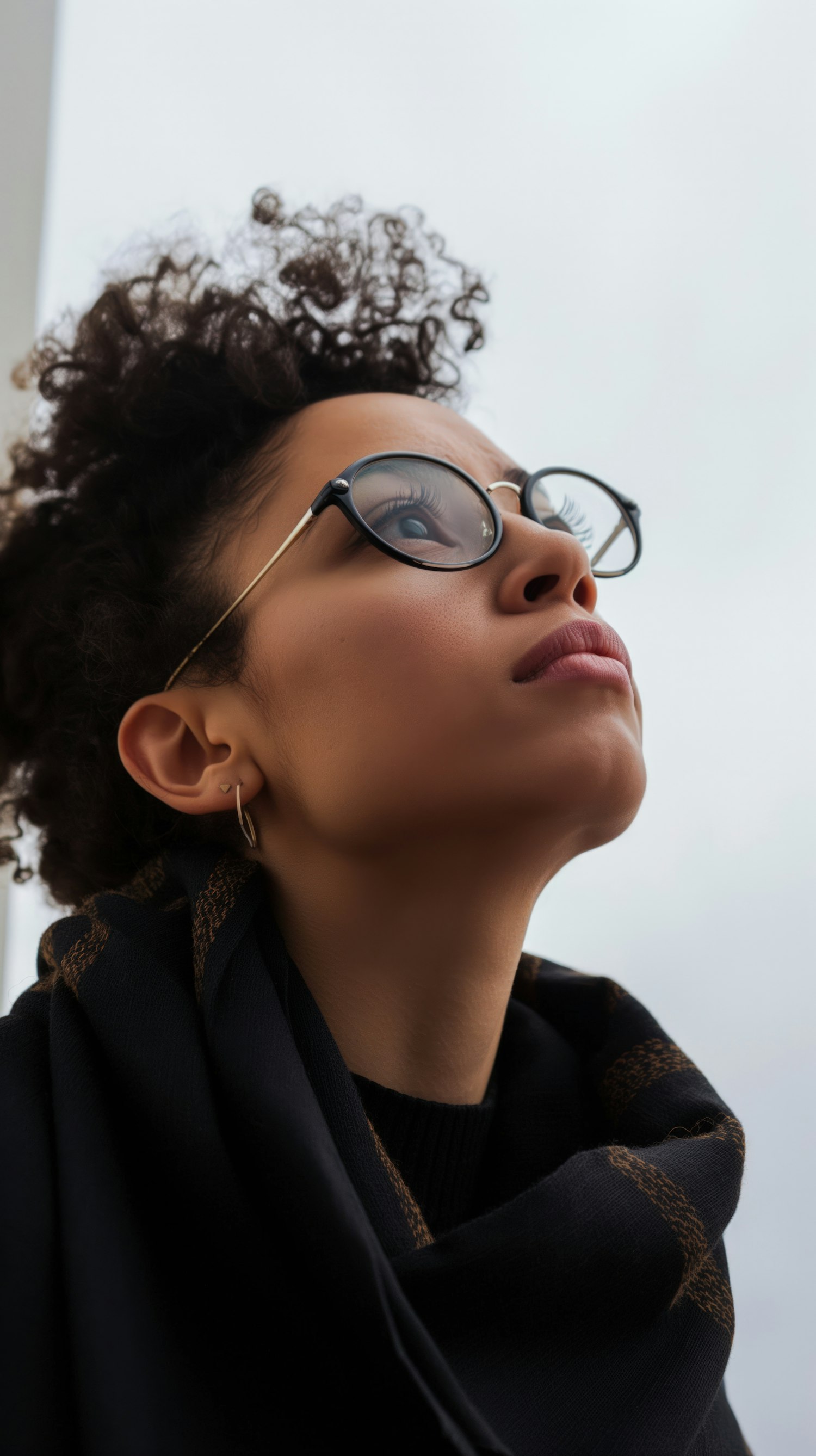 Young woman with curly hair and glasses gazes upwards, wearing a black scarf. Thoughtful expression against an overcast sky.