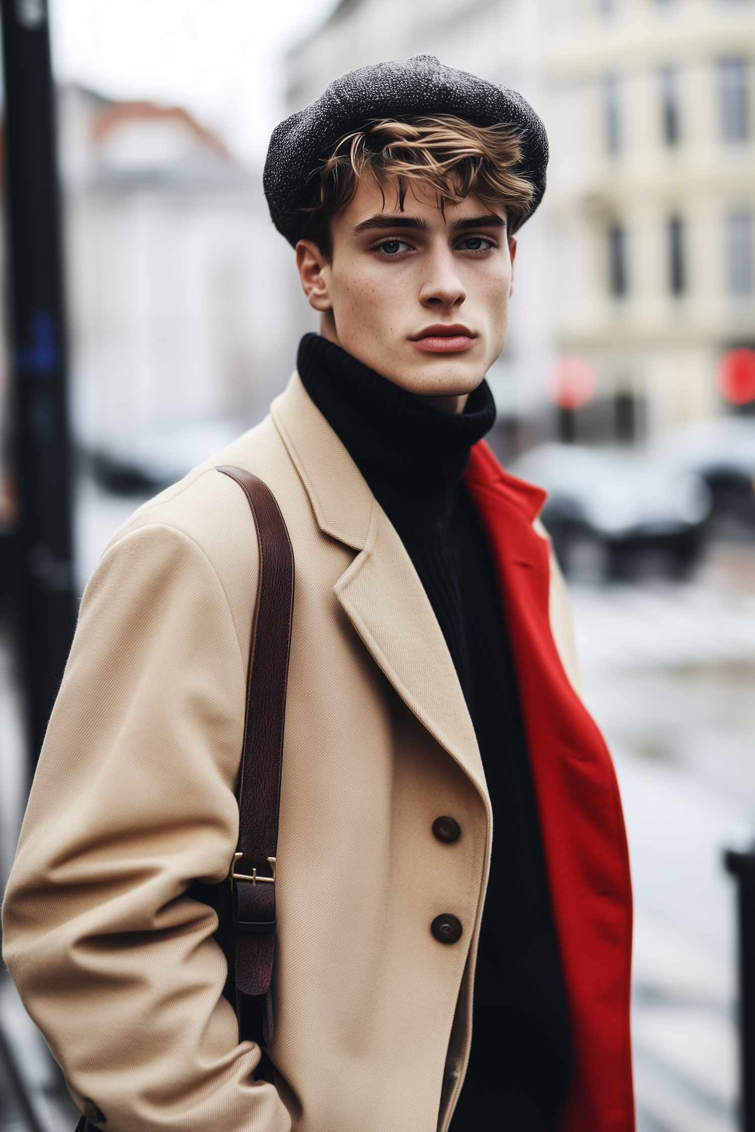 Stylish young man in a beige coat with red lining, black turtleneck, and beret, standing in an urban setting with a neutral expression.