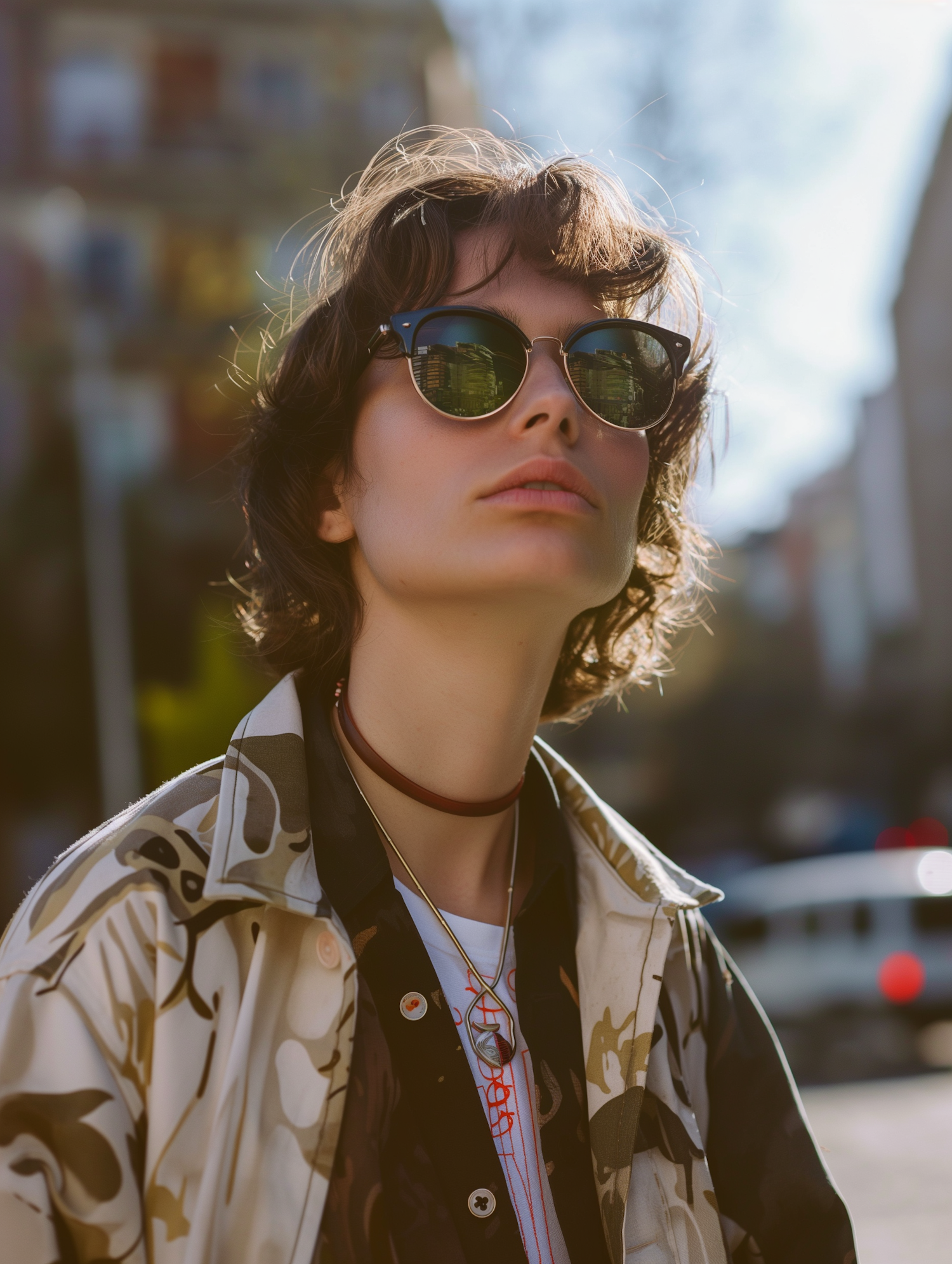 Stylish woman in sunglasses and patterned jacket, standing confidently in a sunlit urban setting.