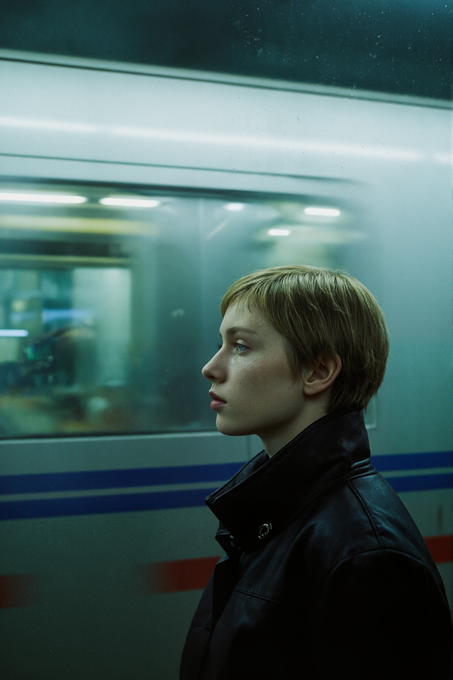 Young woman in a black leather jacket stands in profile as a train speeds by, creating a dynamic urban scene.