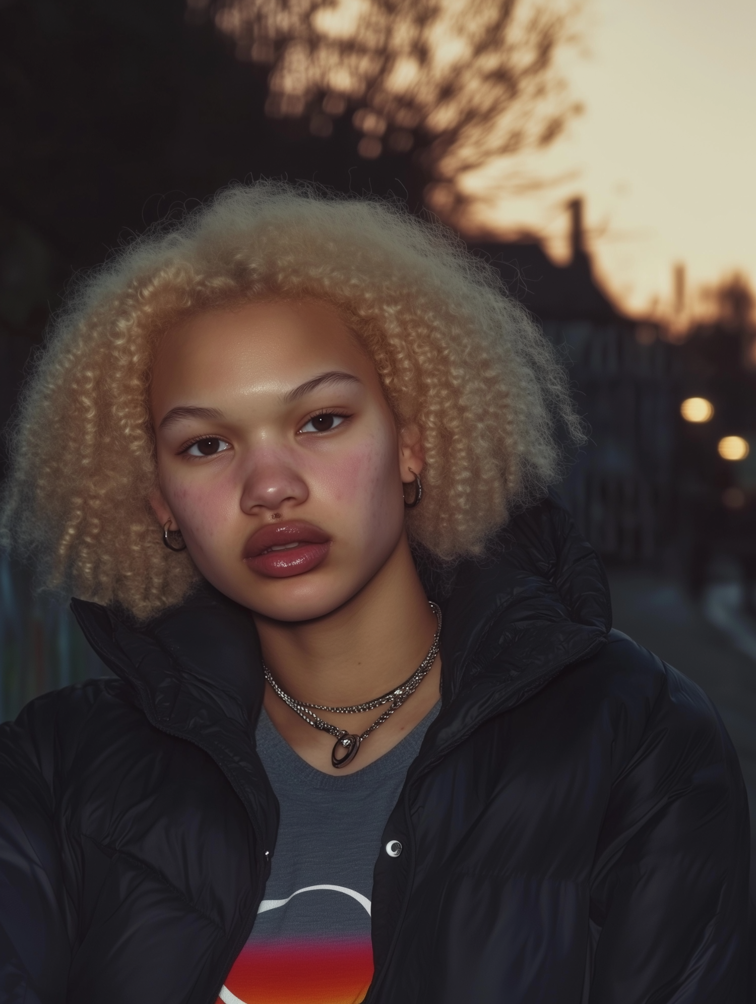A young individual with striking blond curls and trendy attire poses candidly against a blurred urban evening backdrop.