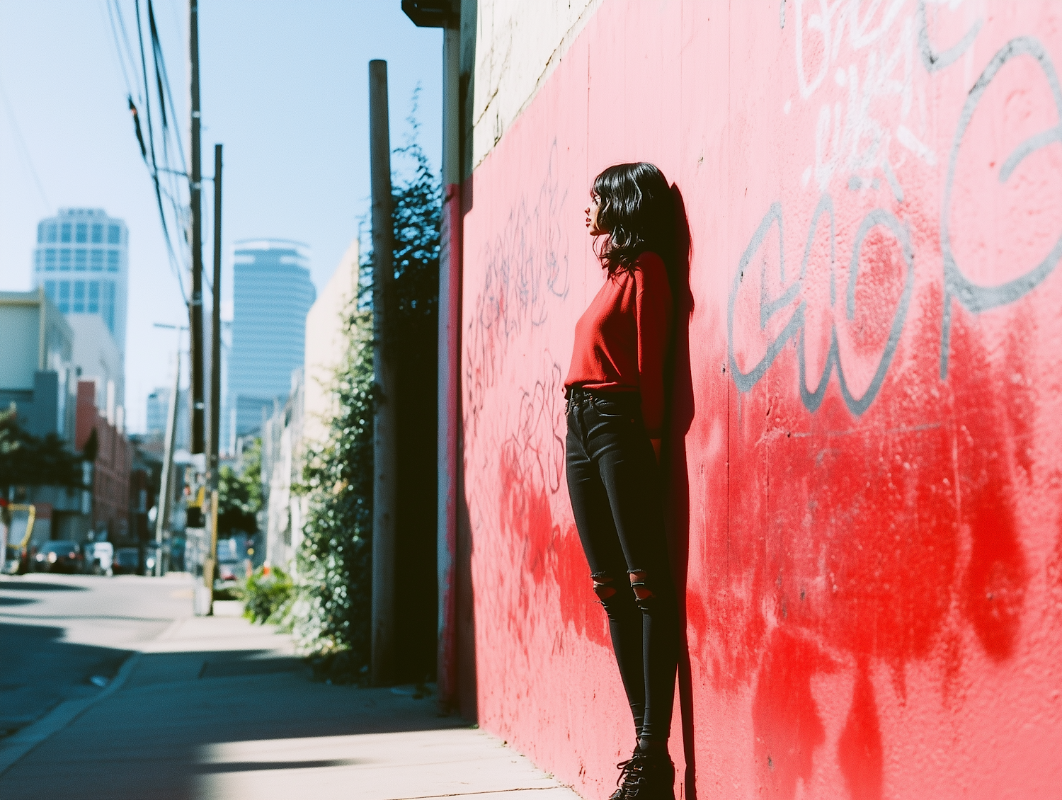 Stylish woman in red top and black jeans leans against a graffiti-covered red wall in an urban setting with modern buildings in the background.