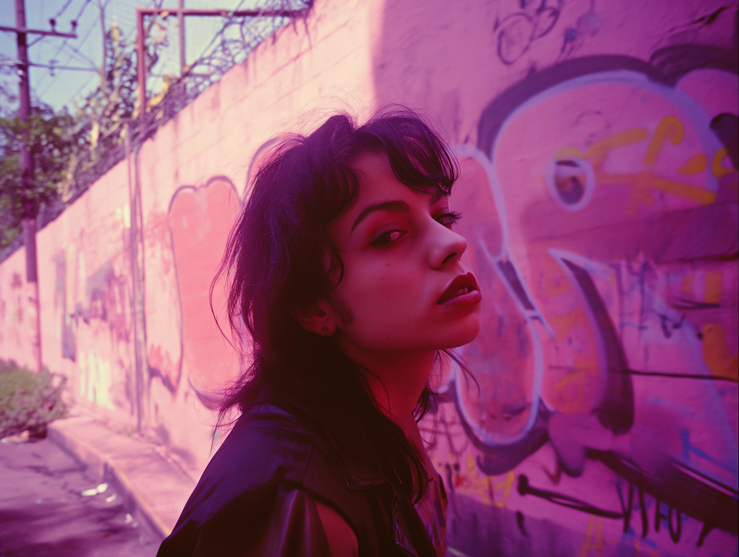 Young woman with dark hair and bold makeup poses against a vibrant graffiti wall, creating an edgy urban vibe.