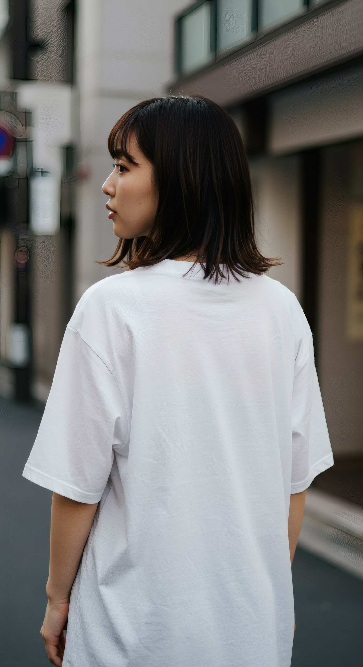 Young Asian woman in a white T-shirt stands on a city street, gazing thoughtfully into the distance. Urban background, soft lighting.