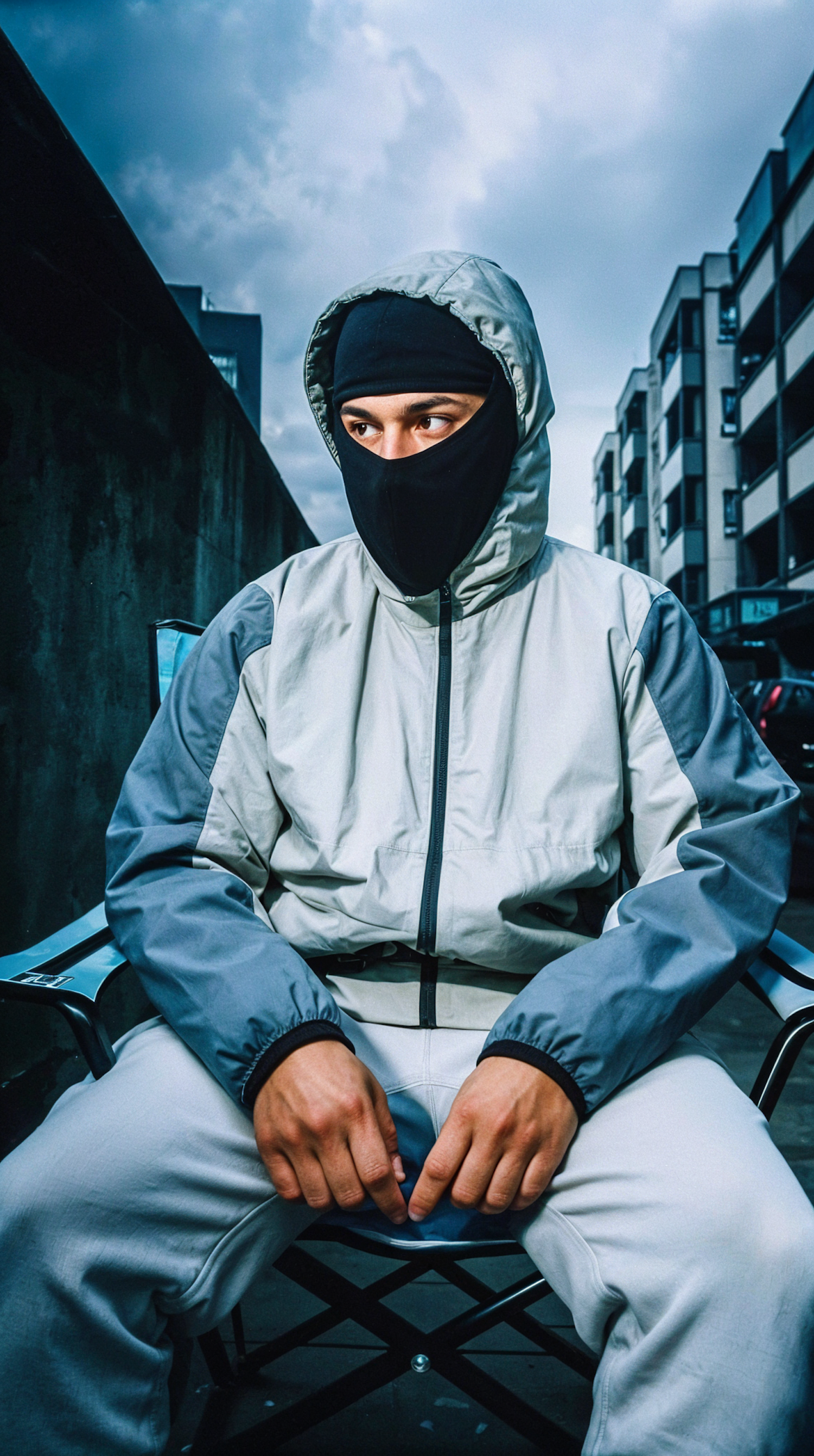 Man in a hooded jacket and balaclava sitting outdoors in an urban setting with a cloudy sky, exuding a moody and intense vibe.