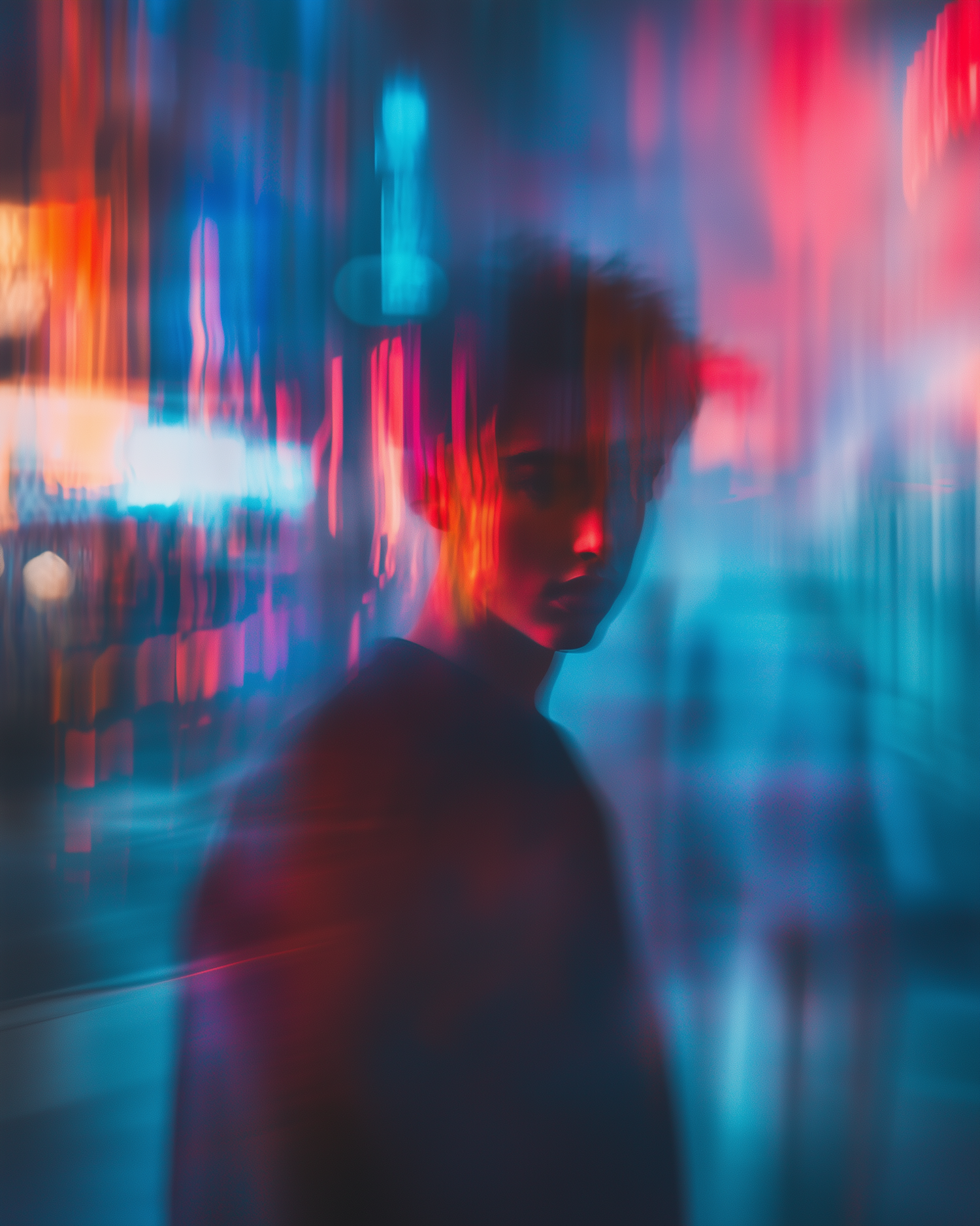 A mysterious figure in a neon-lit urban scene with blurred blue and red lights, creating a dreamlike and futuristic atmosphere.