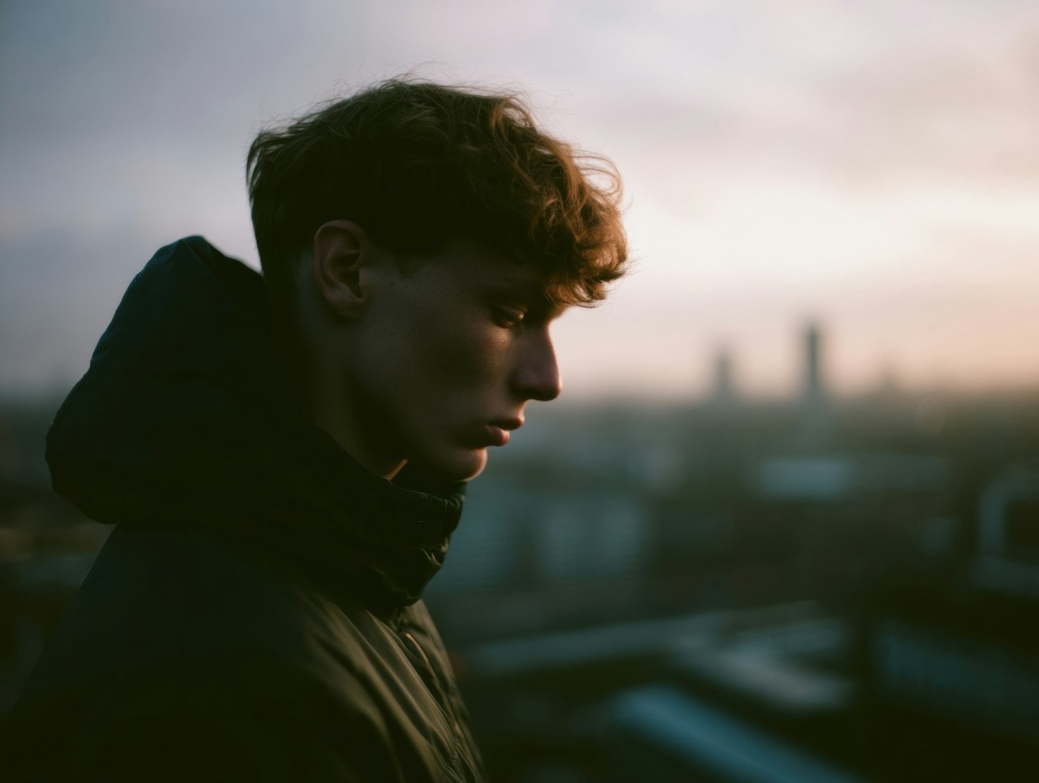 A young man in a dark jacket gazes downward against a hazy urban sunset, creating a contemplative and serene atmosphere.