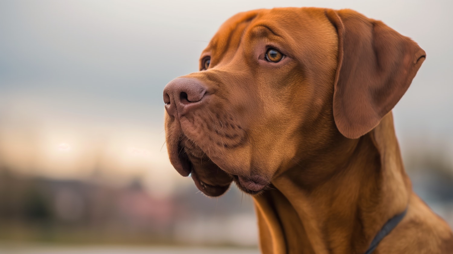 Close-up of a large brown dog with amber eyes, gazing intently. Soft, blurred background enhances the dog's rich, glossy coat.