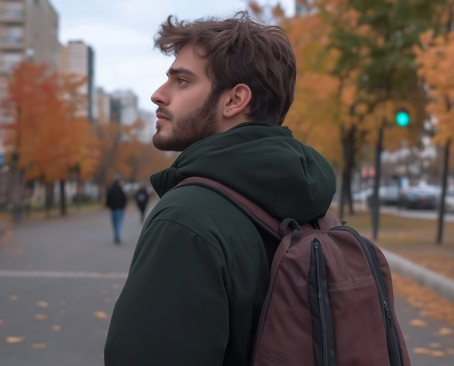 Young man with brown hair and beard in green jacket, carrying a backpack, walks on an autumn city street with orange-leaved trees.