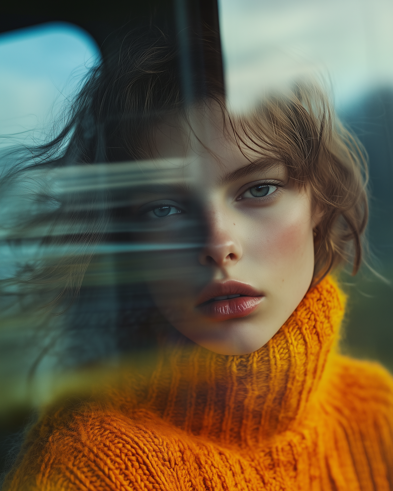 A young woman in an orange sweater gazes through a window, her expression contemplative and the scene artistically blurred.