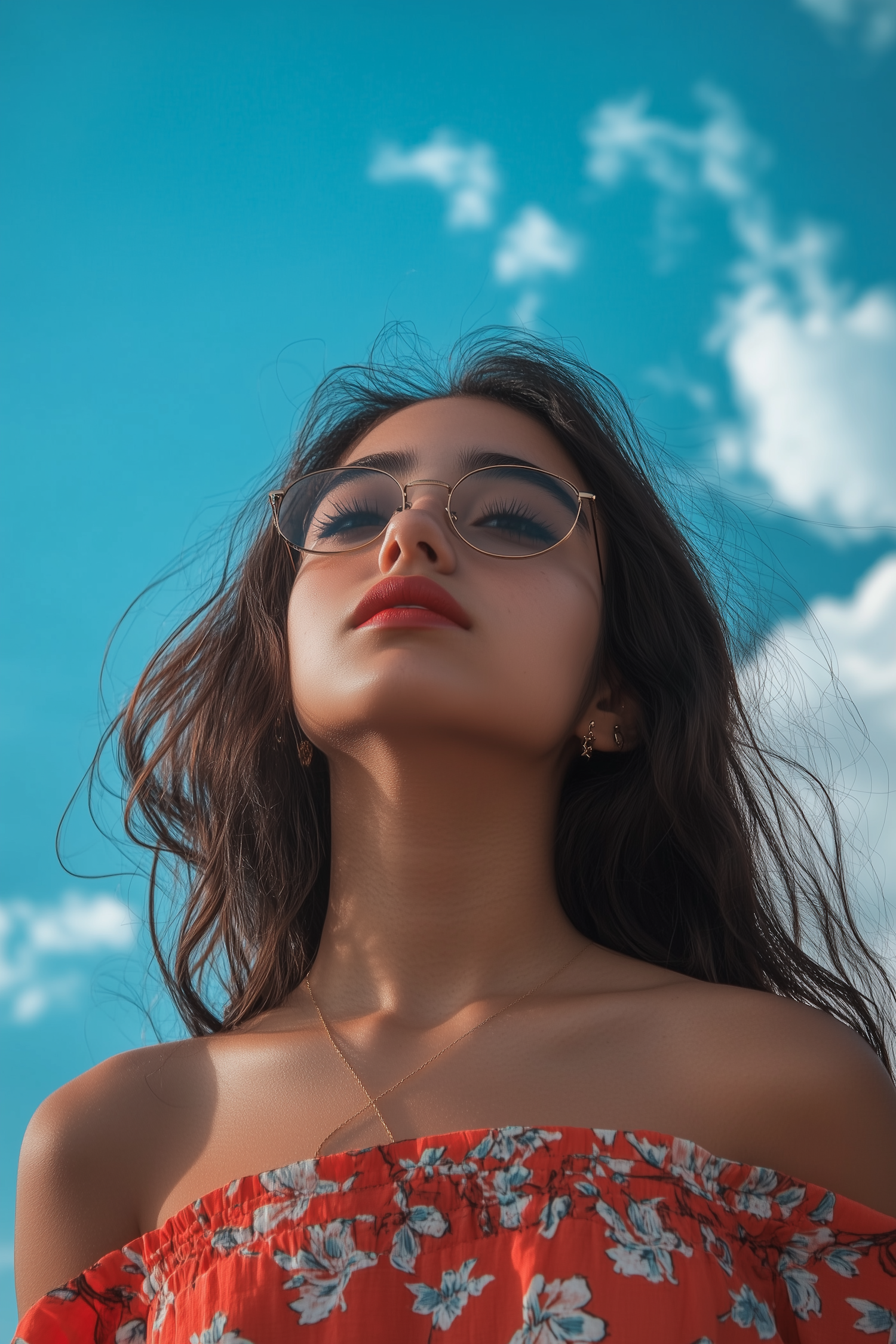 Young woman with glasses gazing at the sky, wearing a red floral top. Bright blue sky with clouds in the background.