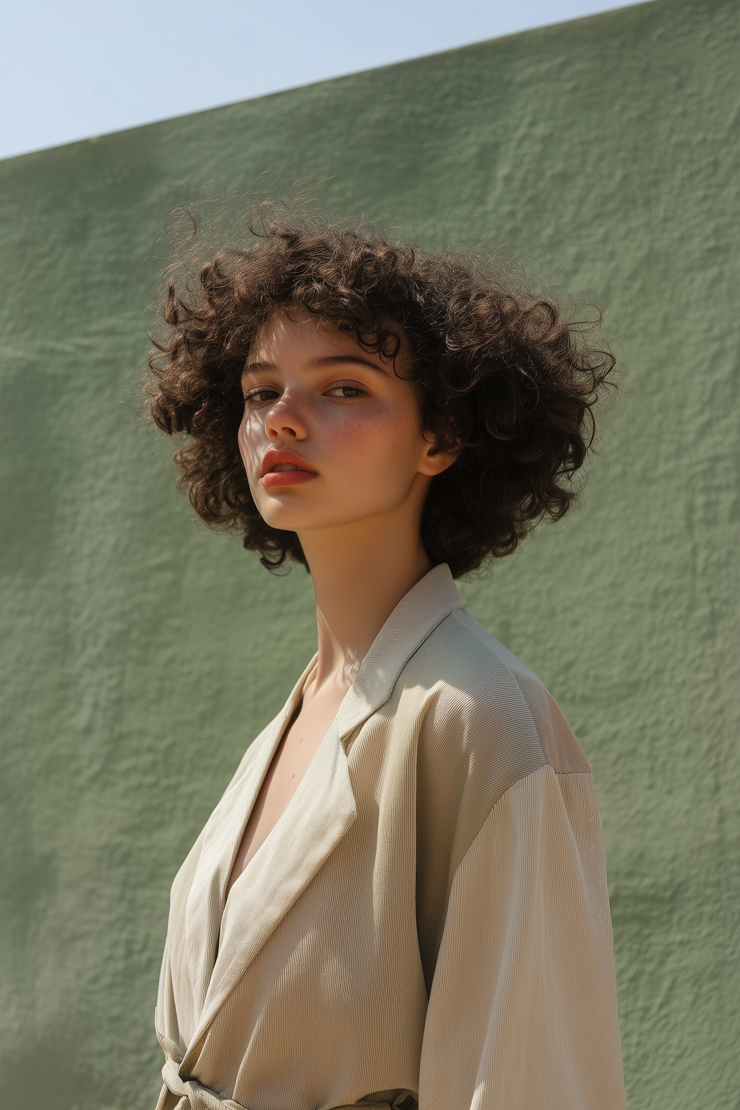 Young woman with curly hair in beige jacket against a green wall, bathed in sunlight, creating a minimalist and serene composition.