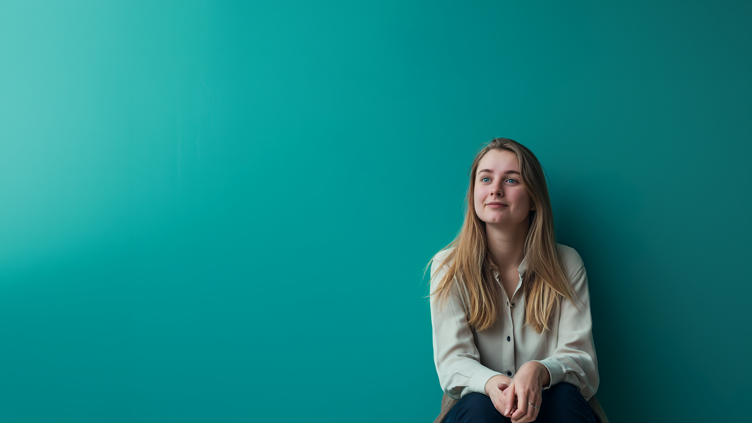 Young woman with blonde hair sits against a teal wall, wearing a light blouse and dark pants, looking thoughtful and serene.