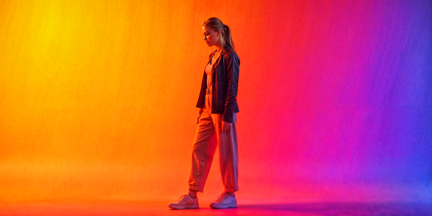 Young woman in casual attire against a vibrant multicolored background, exuding a calm and contemplative vibe.