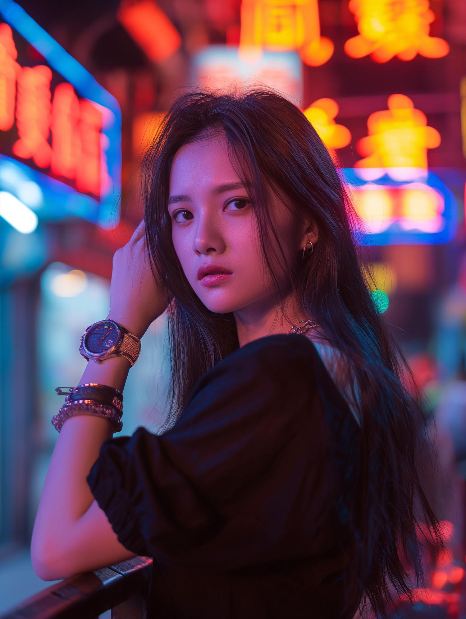 Asian woman in a neon-lit urban setting, wearing a black top and accessories, with vibrant city lights in the background.