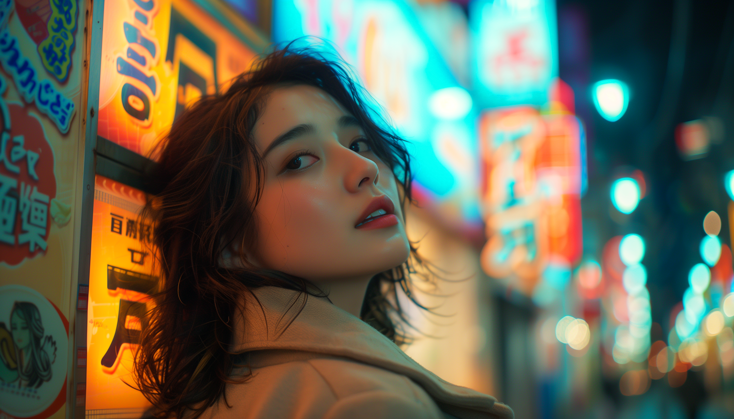 Stylish woman in a beige coat with neon-lit cityscape background, vibrant colors, and dreamy bokeh effect.