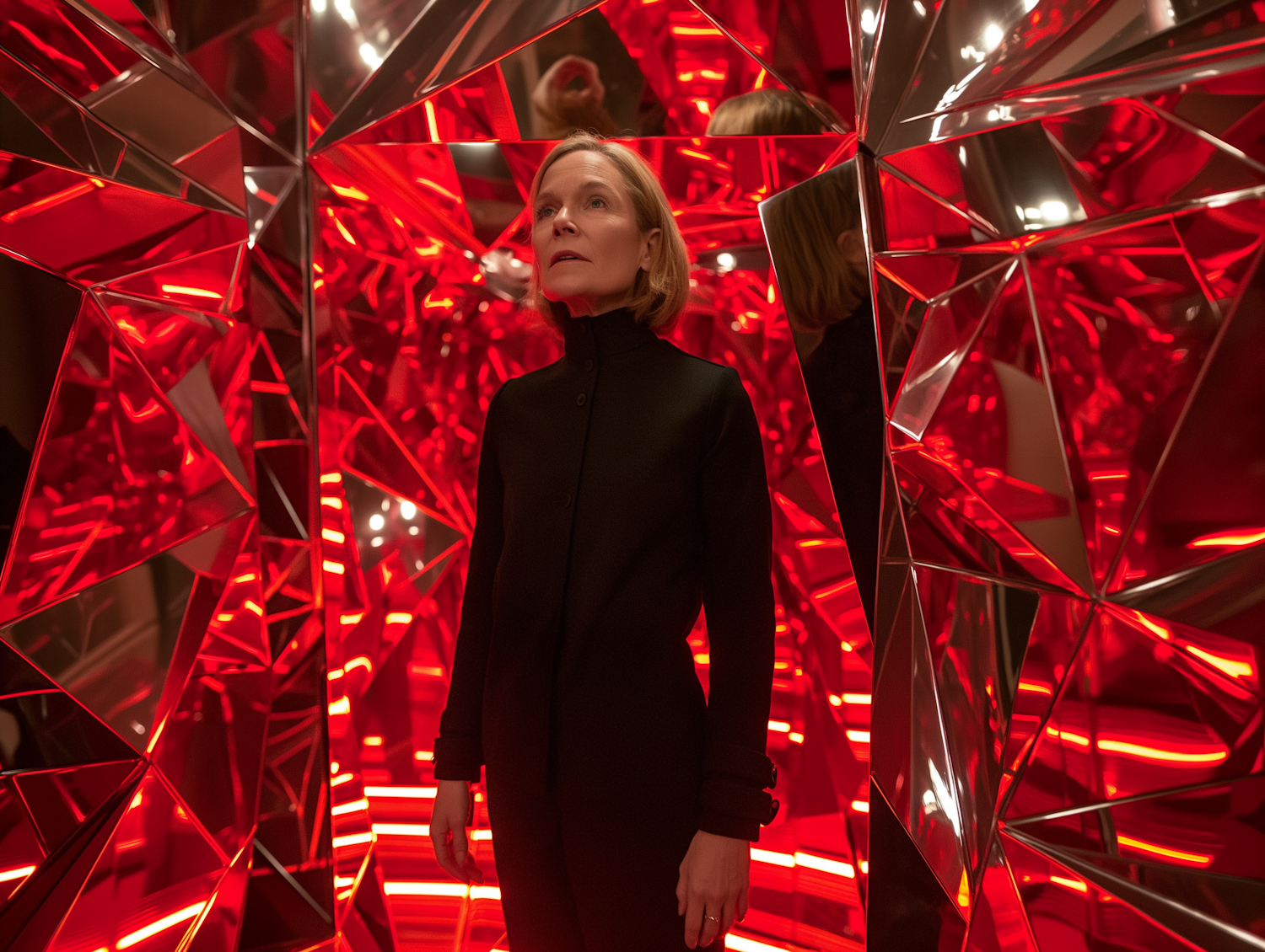 Woman in a futuristic red and mirrored environment, wearing black, with a contemplative expression. Surreal and immersive atmosphere.