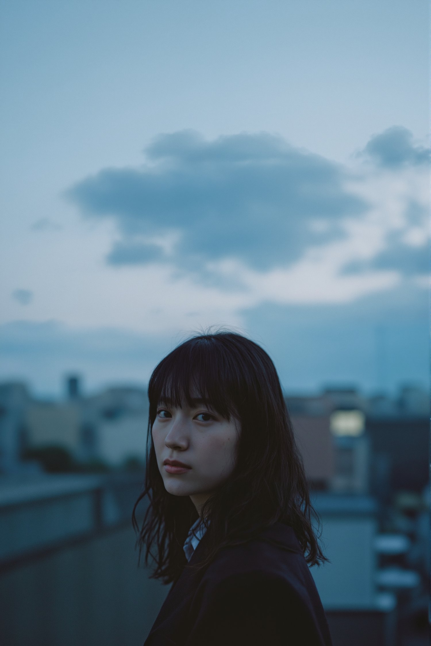 Young woman on a rooftop at twilight, with a serene blue sky and cityscape backdrop, exuding calm and contemplation.