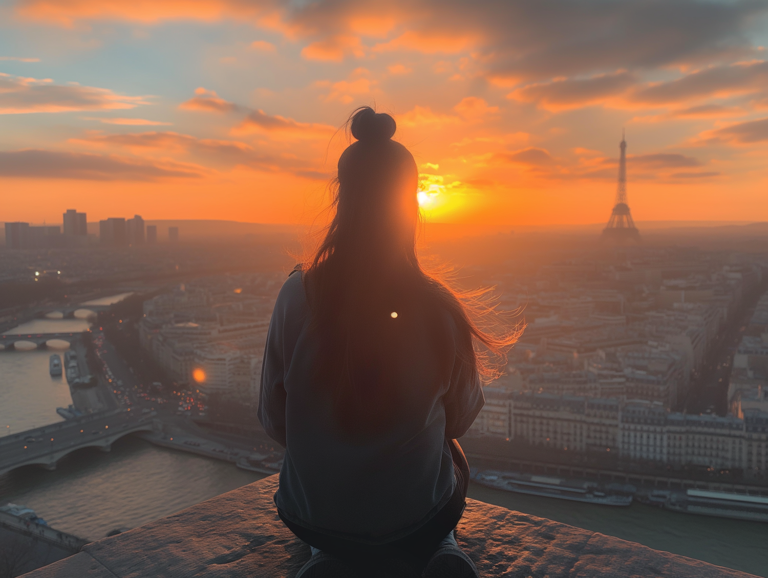 Silhouette of a person overlooking Paris at sunset with the Eiffel Tower in the background.